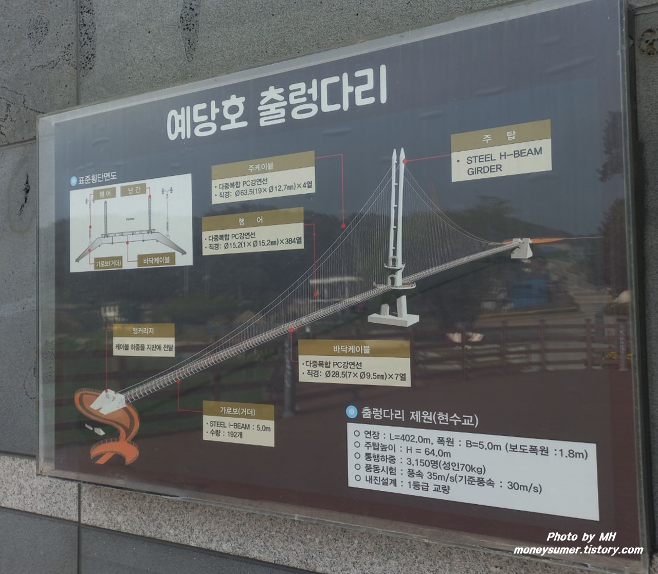 2019년 4월 6일 개통된 출렁다리의 길이는 402m이고 폭은 5m 그리고 보도 폭은 1.8m네요~