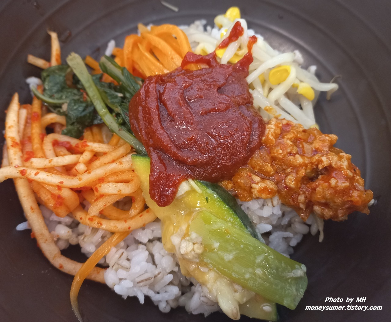 보리밥을 맛있게 먹는 법을 설명해 놓은 대로 먼저 우렁쌈장에 쌈을 몇 번 싸 먹은 후 삼색나물과 밑반찬, 고기 쌈장, 그리고 참기름과 고추장을 넣어서 비벼 먹었어요. 욕심을 부리는 바람에 고추장을 너무 많이 넣어서 좀 짜더라고요. 그래서 신랑 밥까지 조금 더 첨가해서 비벼 먹으니 간이 적당하니 맛있더라고요~😄