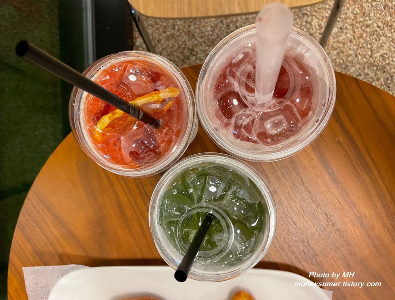 에이드 모두 알갱이가 씹히는 맛이 좋아요. 많이 달지 않은 점도 좋더라고요~