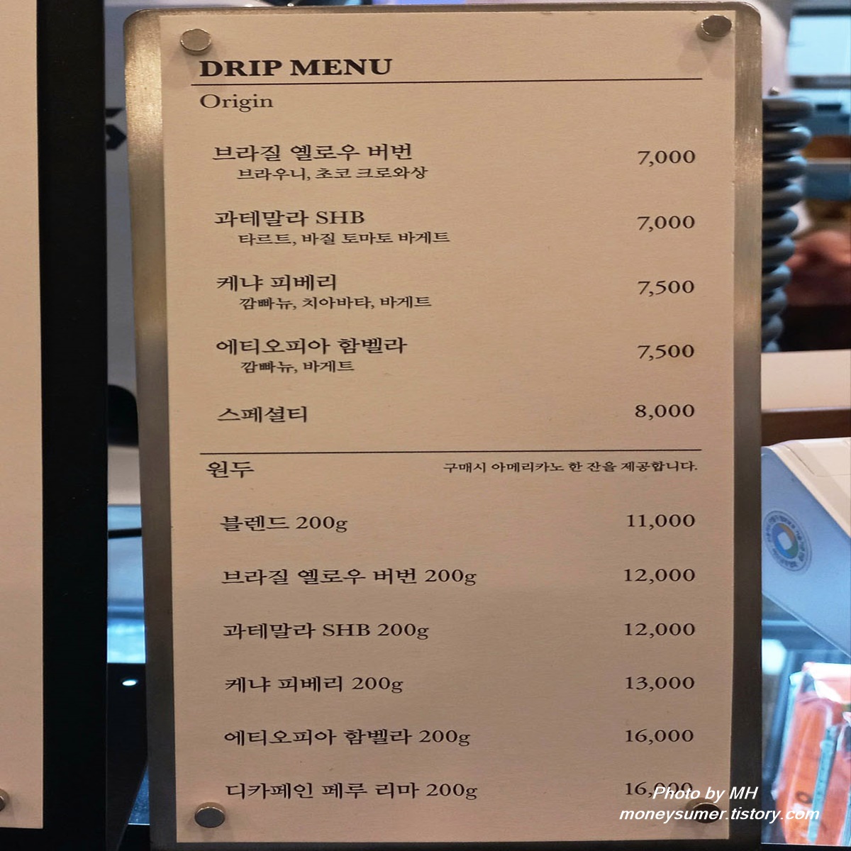 - 커피류 : 아메리카노 5,500원 ~ 스페니쉬 라테 6,500원(추가 요금을 내고 디카페인이나 샷과 휘핑 추가 가능)