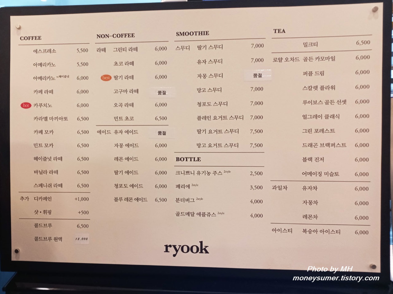 - 티류 : 복숭아 아이스티 6,000원 ~ 밀크티 6,500원