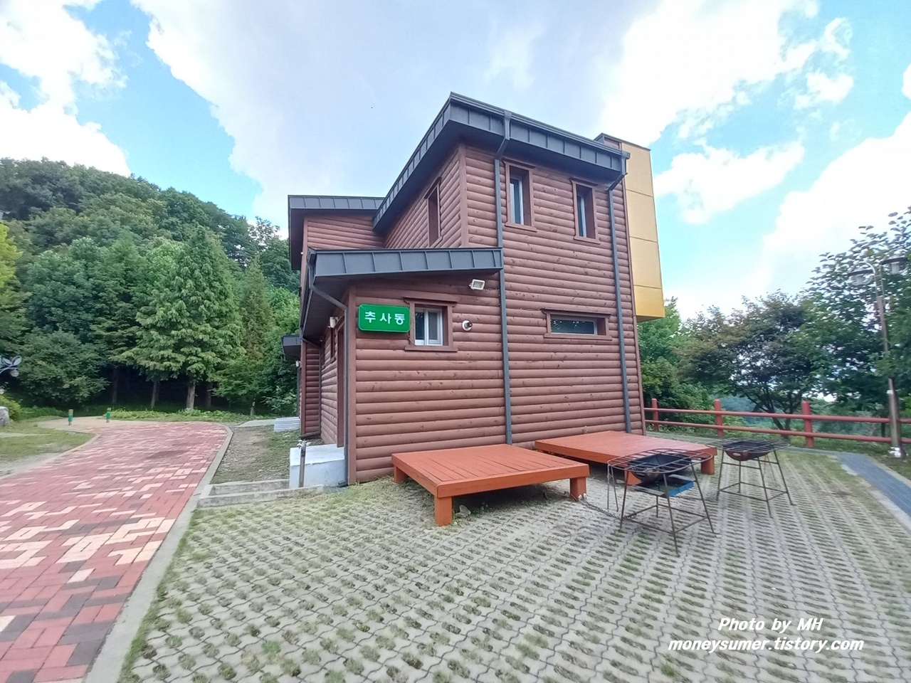 숙박시설의 외관은 대체로 이렇게 되어있어요. 평상과 숯불화로대가 비치되어 있어 고기나 해물 구워 먹기 너무 좋아 보여요~ 숙박시설 이용을 원하시는 분은 봉수산 휴양림 홈페이지를 참고하시면 된답니다~
