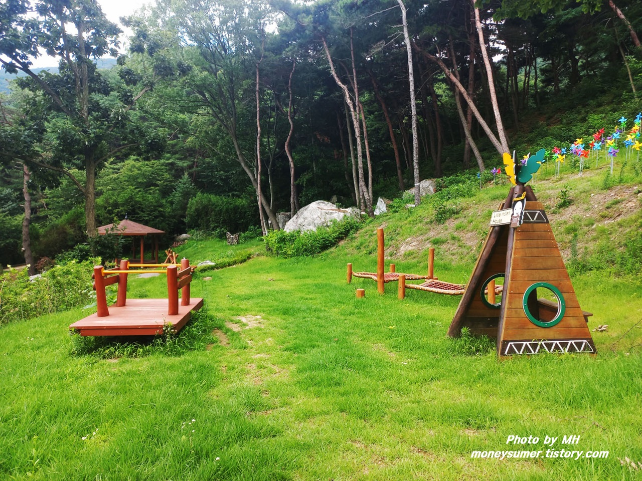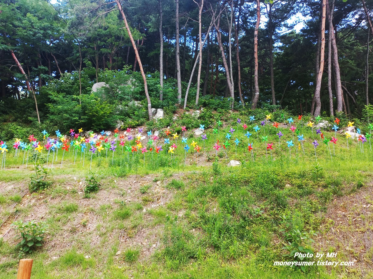 하늘데크에서 내려와 보니 유아 숲 체험원이 보이네요. 색색의 바람개비와