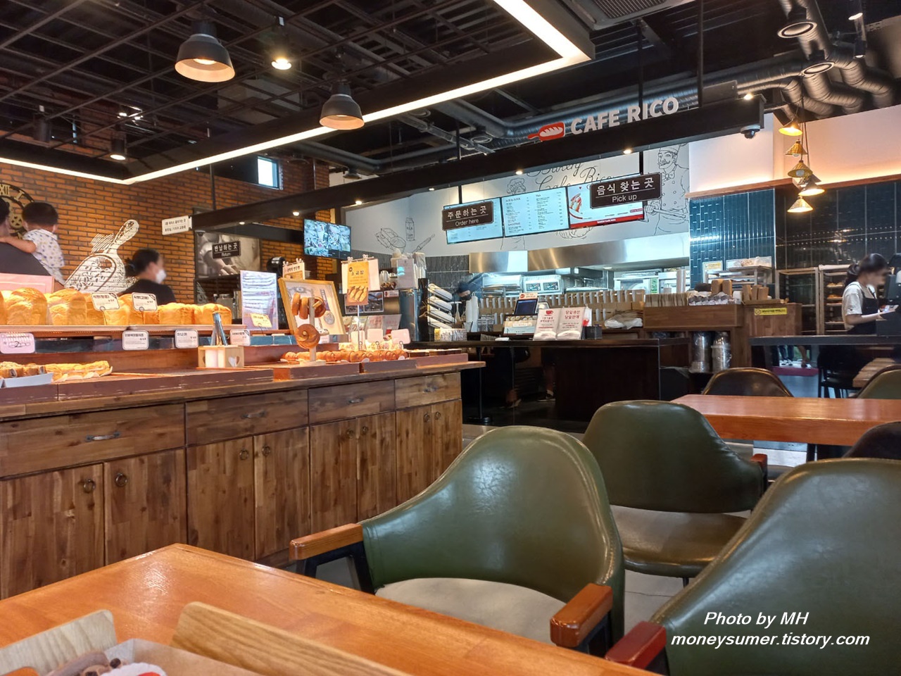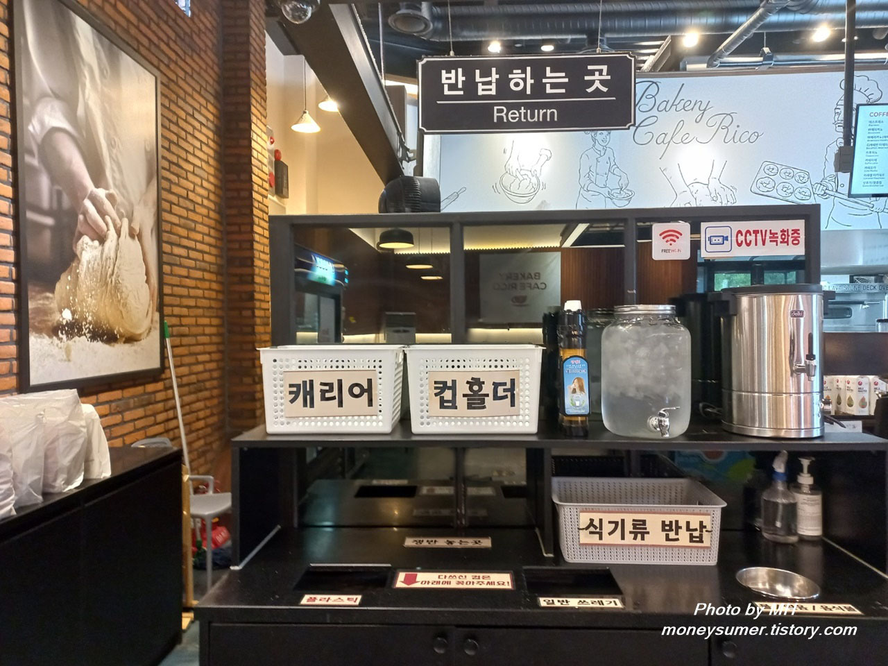 중앙에 다양한 빵들이 놓여있고 양옆으로 테이블이 있는 구조예요. 주문하는 곳, 음식 찾는 곳, 반납하는 곳이 나눠져 있네요~