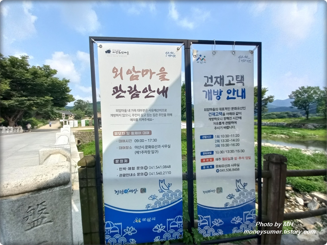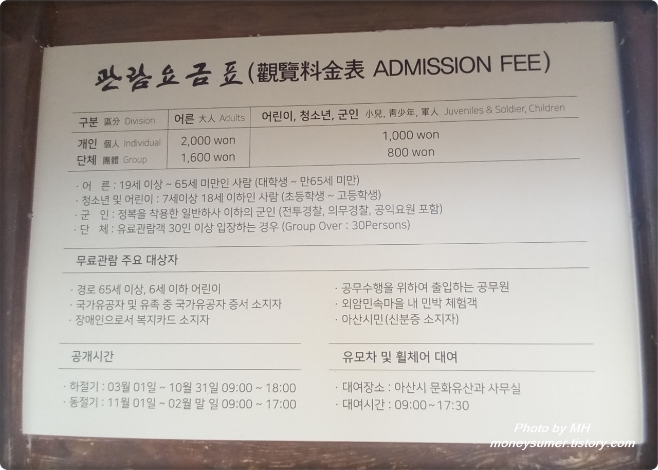 - 무료관람 대상자 : 65세 이상, 6세 이하 어린이, 국가유공자, 장애인(복지카드 소지자), 공무원(공무수행 출입 시), 외암 민속마을 내 민박체험객, 아산시민(신분증 소지자)