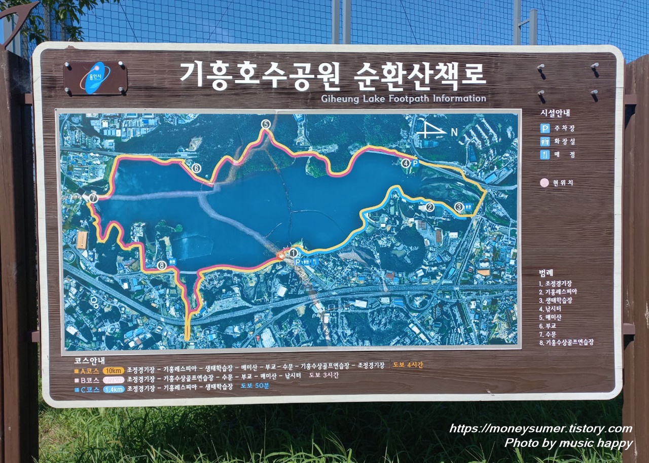 - B코스 7.7km : 조정경기장-기흥 수상 골프연습장-수문-부고-매미산-낚시터☞ 도보 3시간