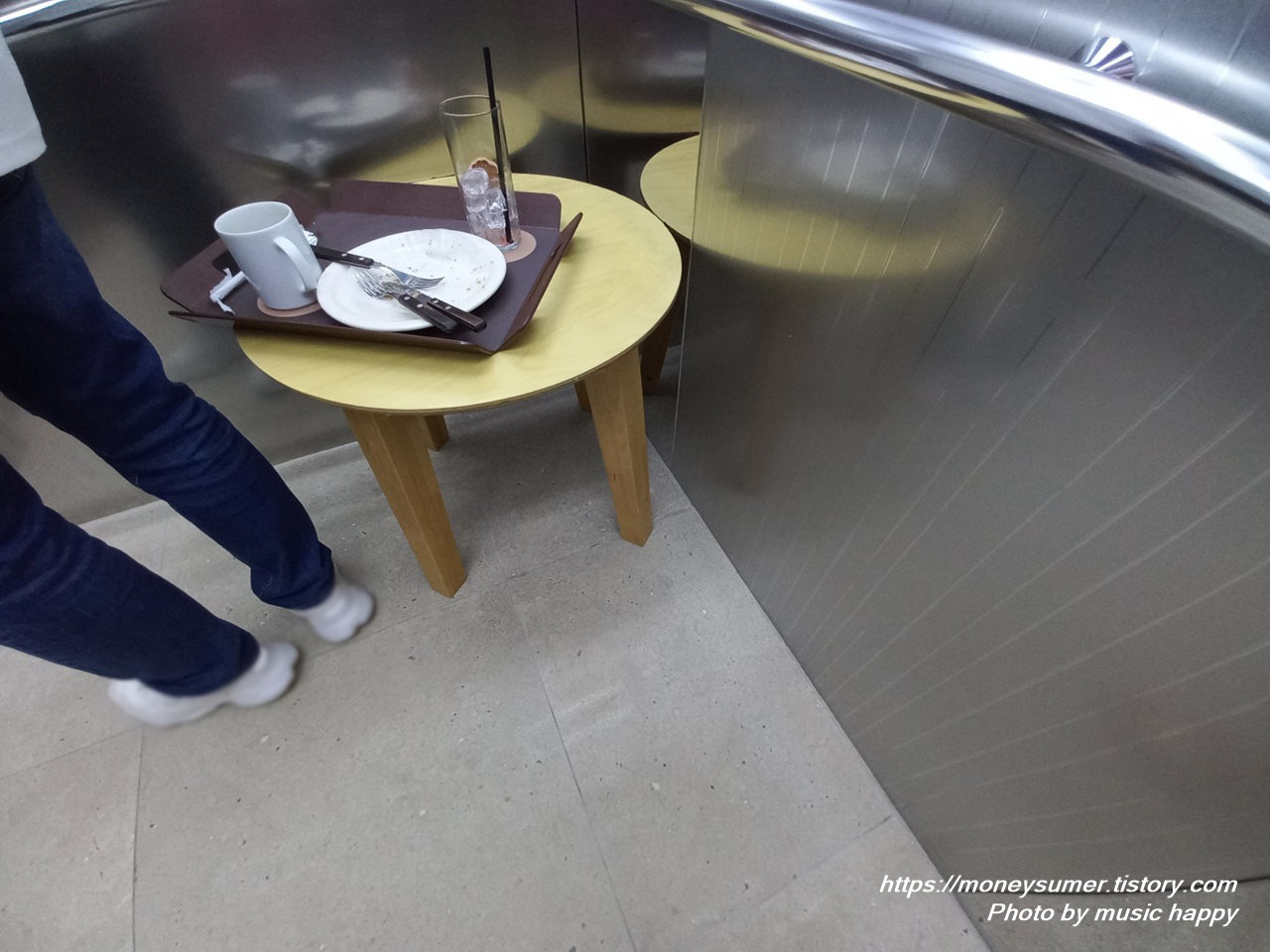 루프탑에서 내려와서 집으로 가기 위해 엘리베이터를 탔는데 이렇게 쟁반을 놓을 수 있게 테이블이 마련되어 있어 좋더라고요. 물론 이곳에 두고 내리시면 안 되고 엘리베이터 타는 동안만 잠시 놔두는 곳인 것 같아요~ 이런 센스 좋네요~