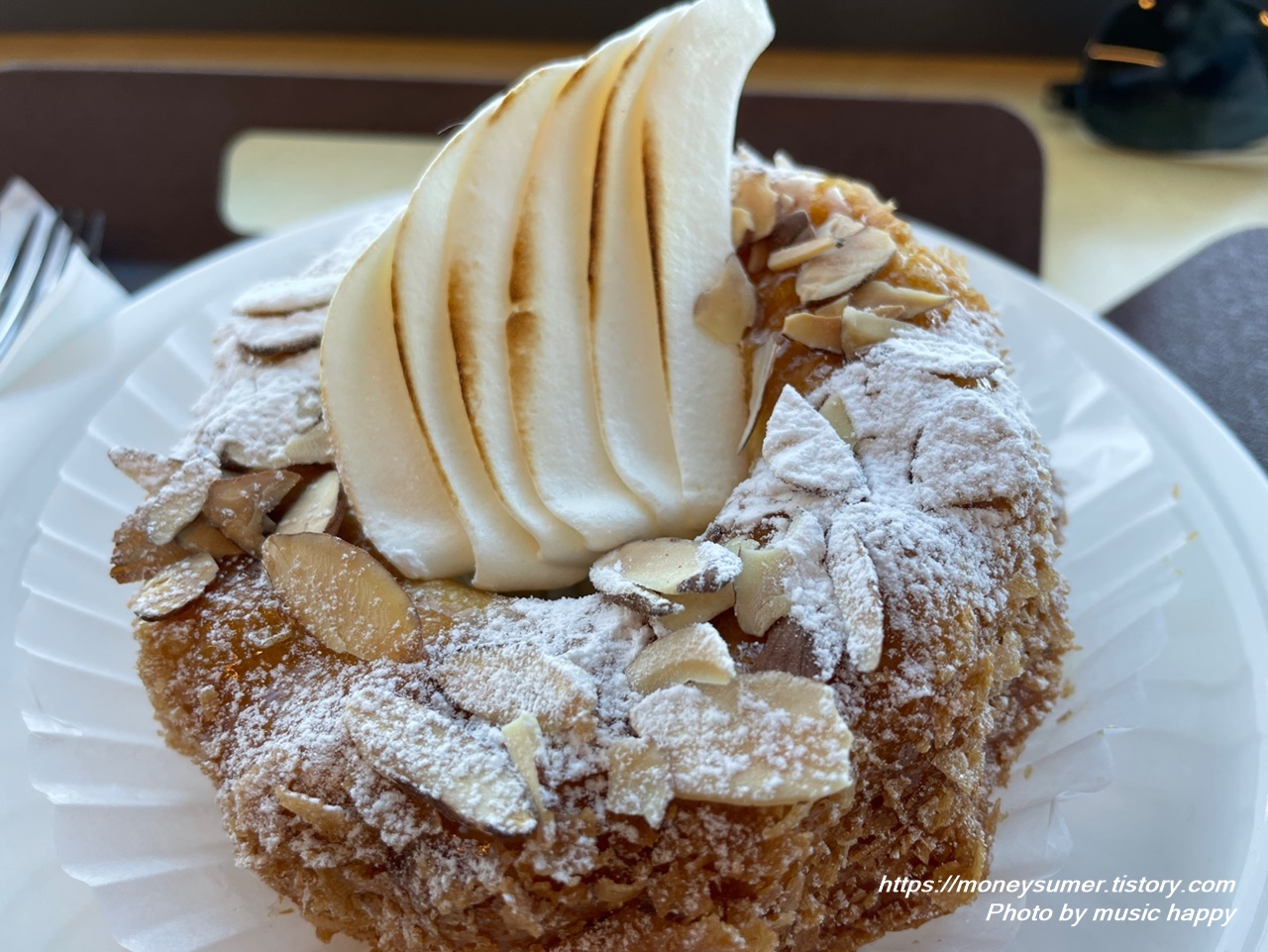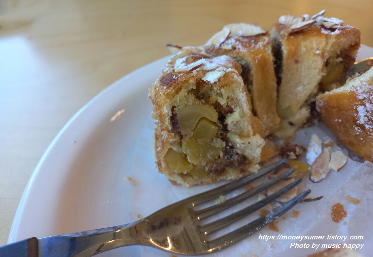 아몬드가 듬뿍 뿌려져 있는 밤식빵은 늘 봐오던 식빵 모양이 아니라서 식빵 같지가 않네요.