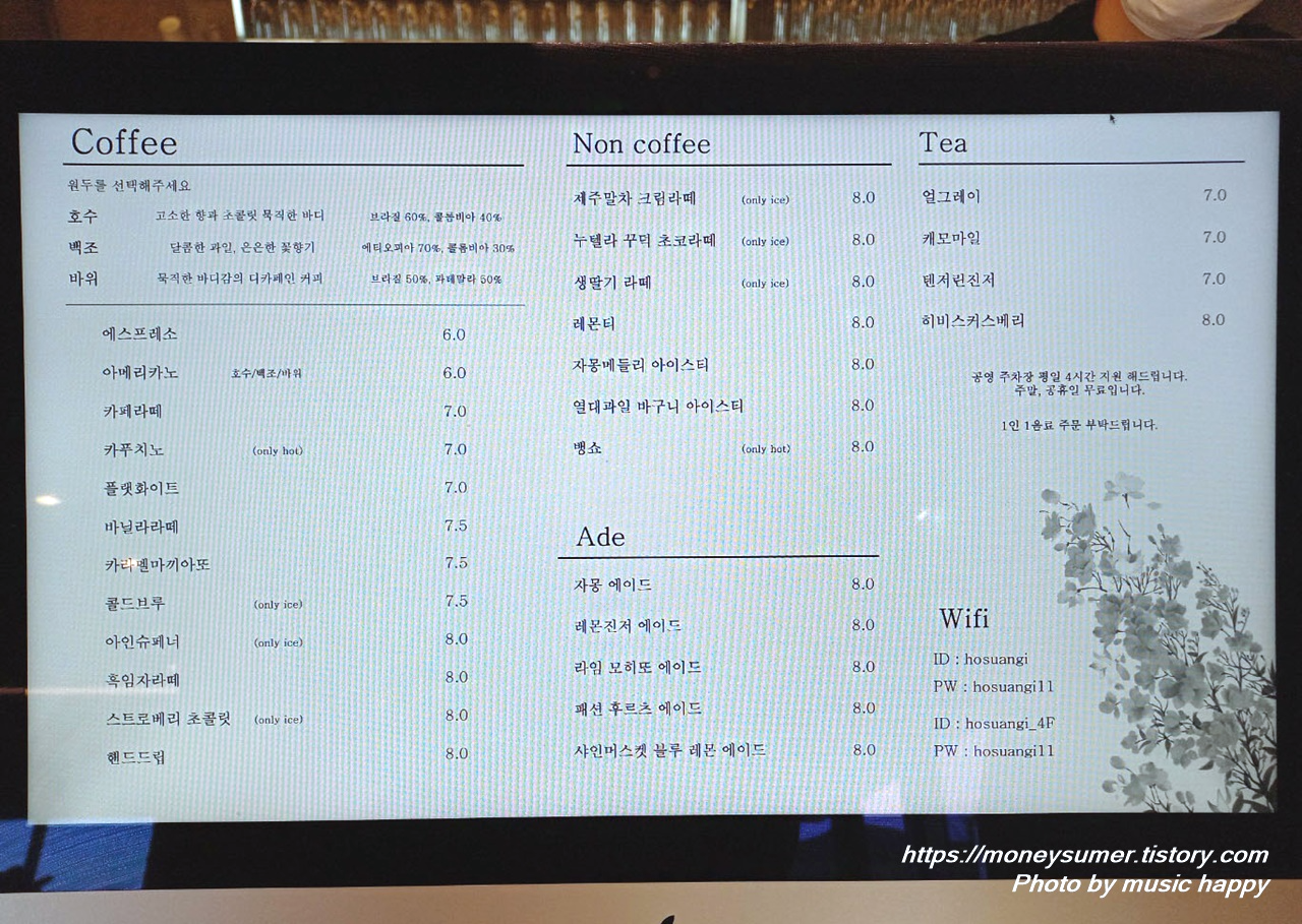 커피류는 6,000원 ~ 8,000원이고 라테류와 에이드류는 8,000원, 티는 7,000~8,000원이라 가격대는 좀 있는 편이네요~