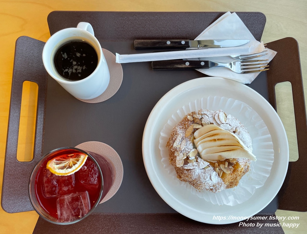 아메리카노(6,000원)와 열대과일바구니 아이스티(8,000원) 그리고 밤식빵(7,000원)이에요~