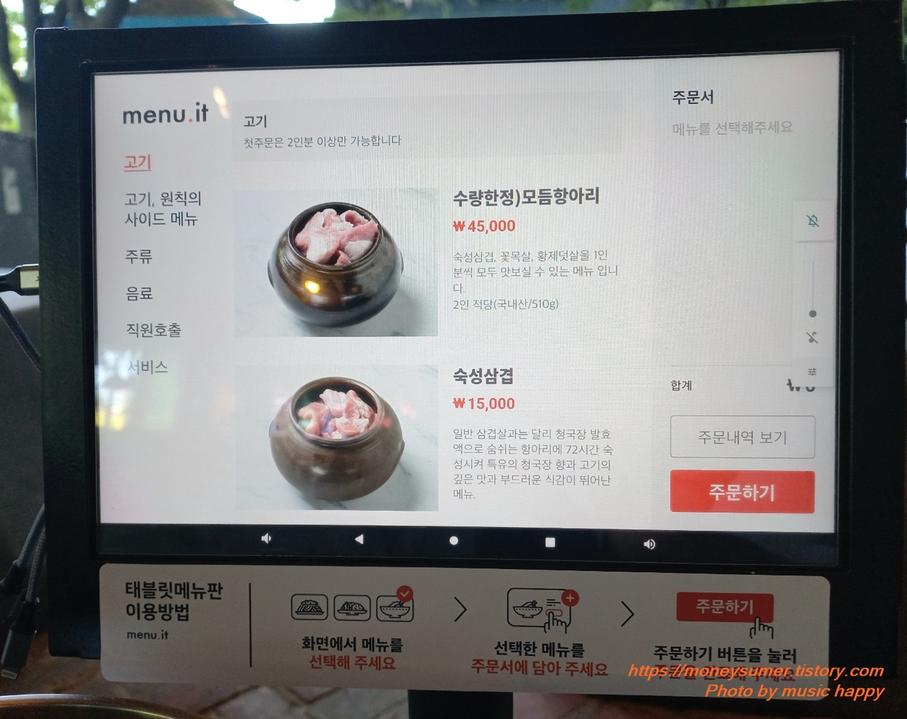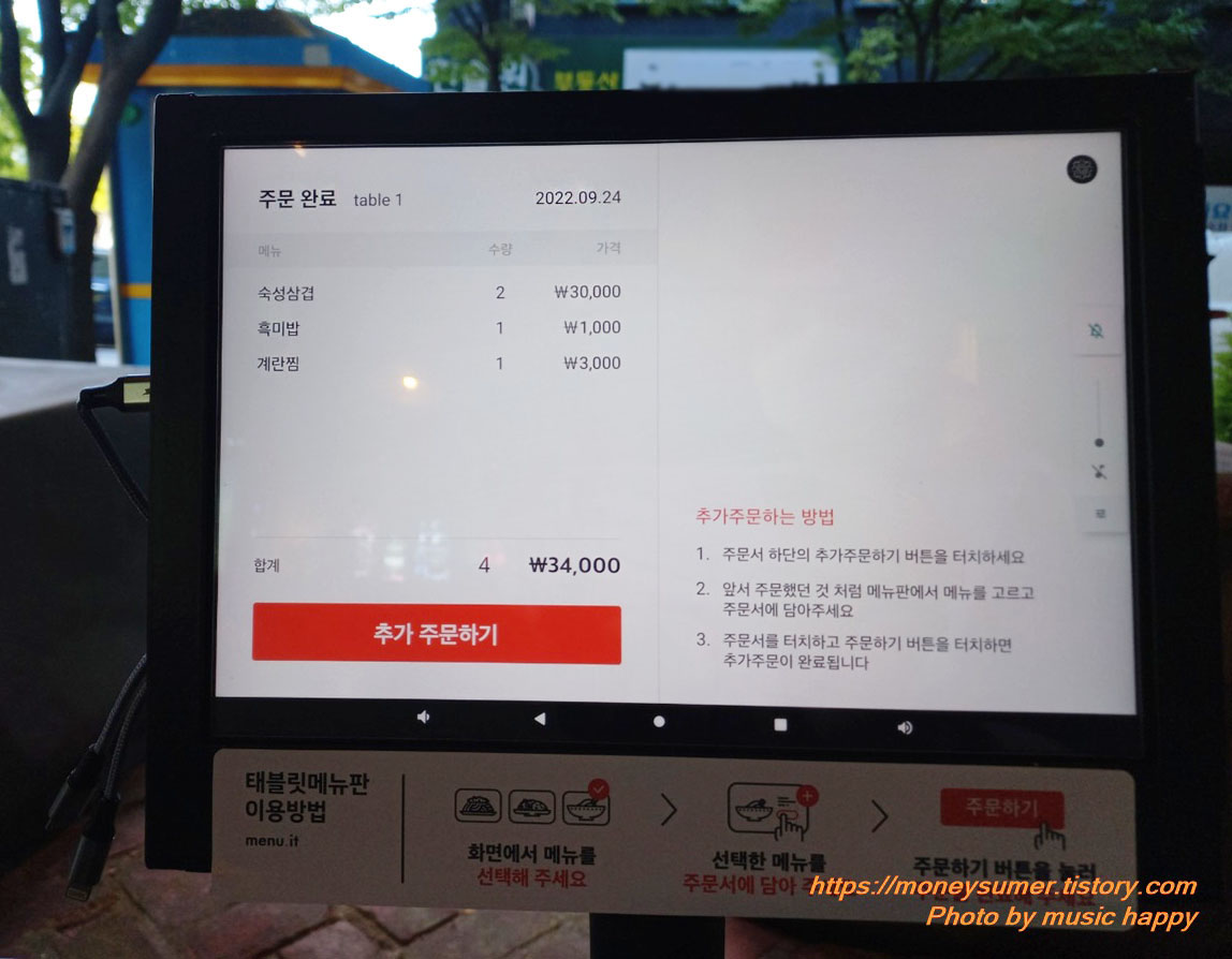 태블릿으로 고기와 밥, 계란찜을 주문한 후 기다리고 있으니 얼마 안 있어