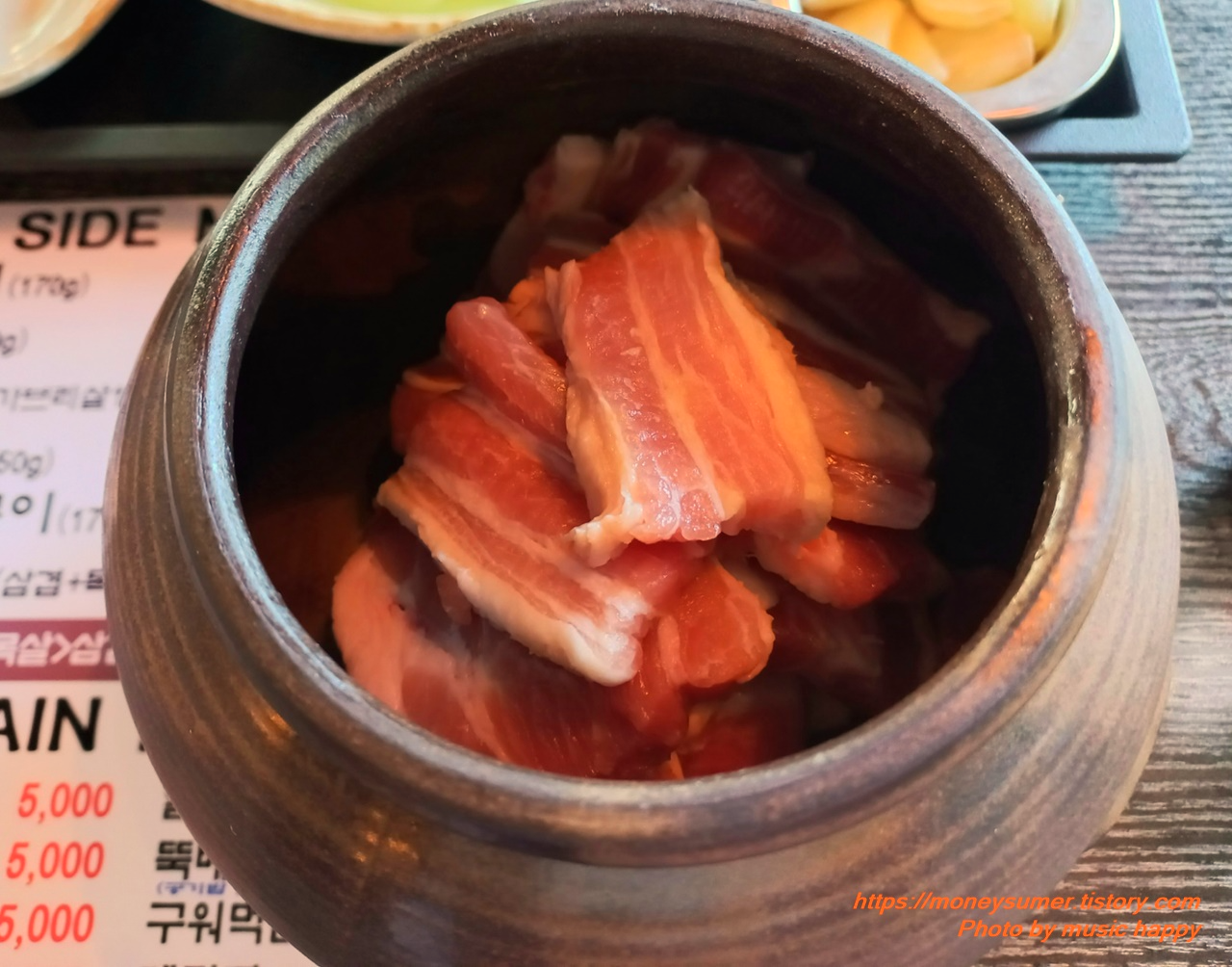 72시간을 숙성시켰다는 삼겹살이 항아리에 담겨서 나왔어요.