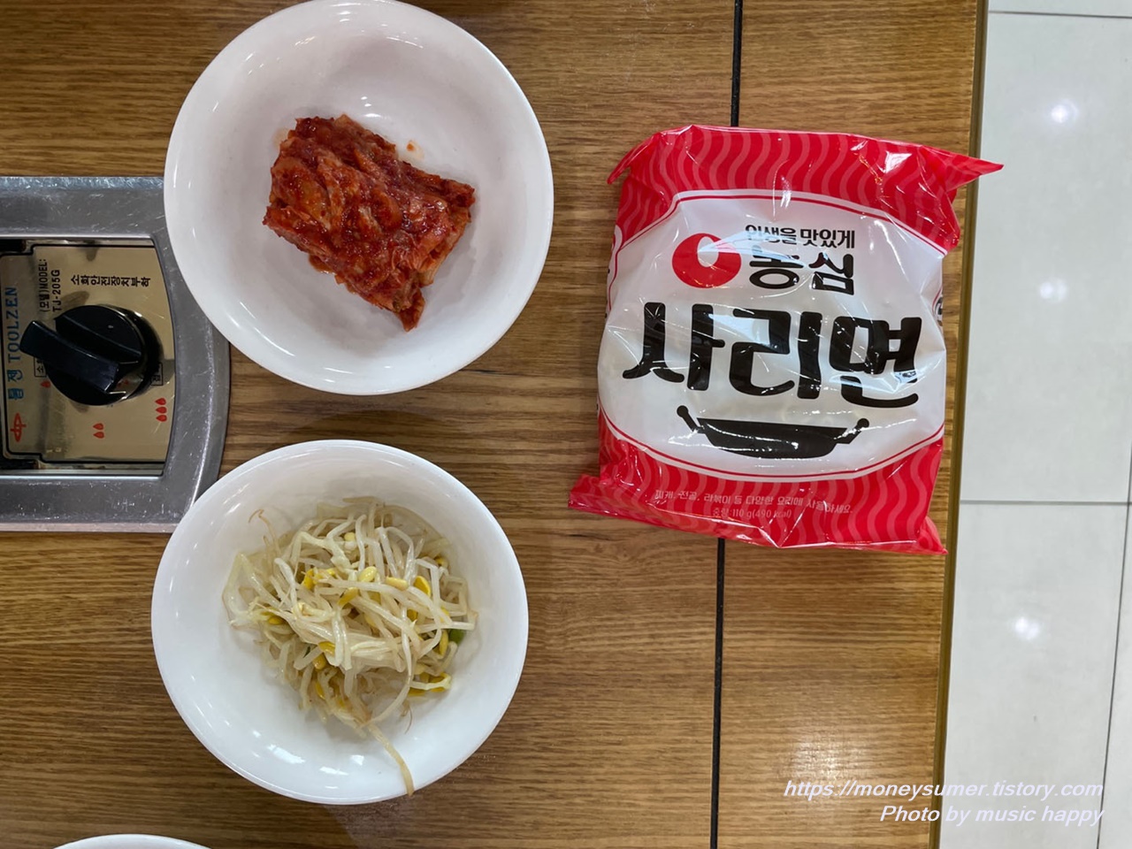 밑반찬으로는 간단하게 김치와 콩나물이 나오고 2인분 이상 시 사리면 하나는 서비스로 나오네요~