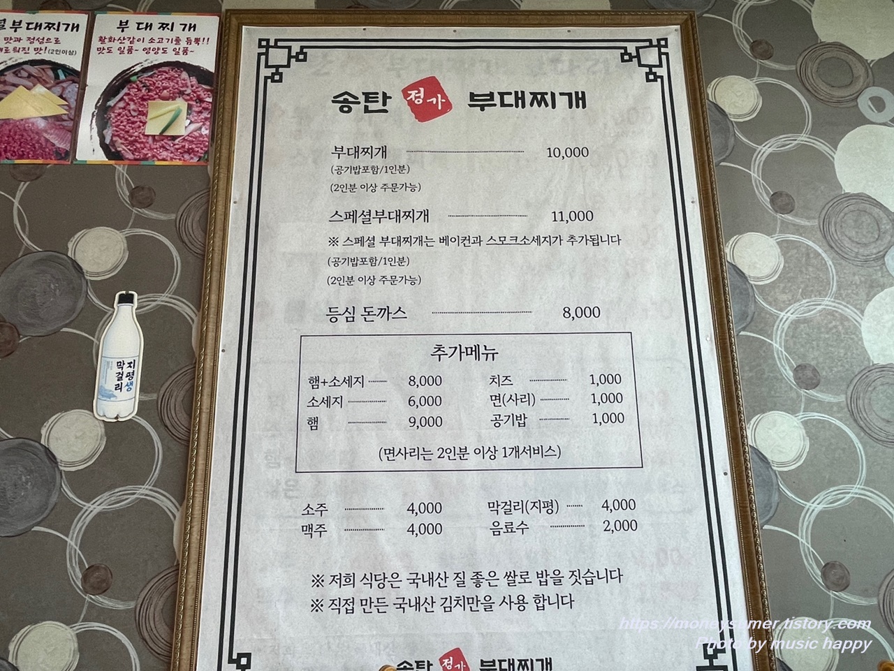 코다리찜도 판매하는 것 같은데 저희가 앉아있는 자리에서는 코다리찜 메뉴가 안보였어요. 무튼 저희는 부대찌개를 먹으러 왔기 때문에 부대찌개 메뉴판을 보고 주문했어요.