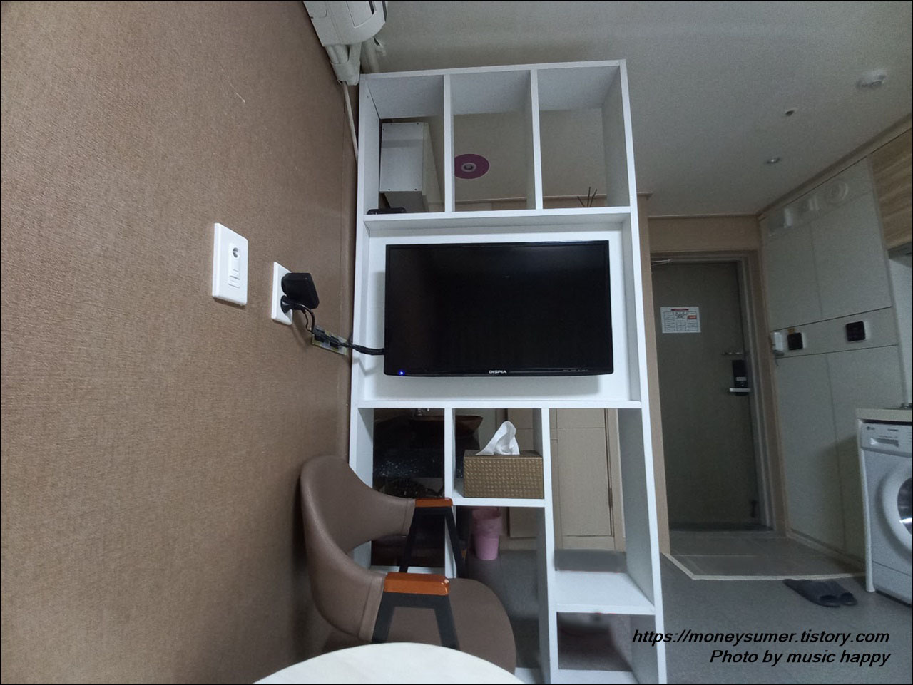넷플릭스 시청이 가능한 TV가 있는데 위치가 너무 안좋았어요. 침대 옆으로 누워서 봐야 하는 위치이고 의자에 앉아서 보기에는 의자는 낮은데 TV가 높은 곳에 있어서 고개가 아프더라고요~