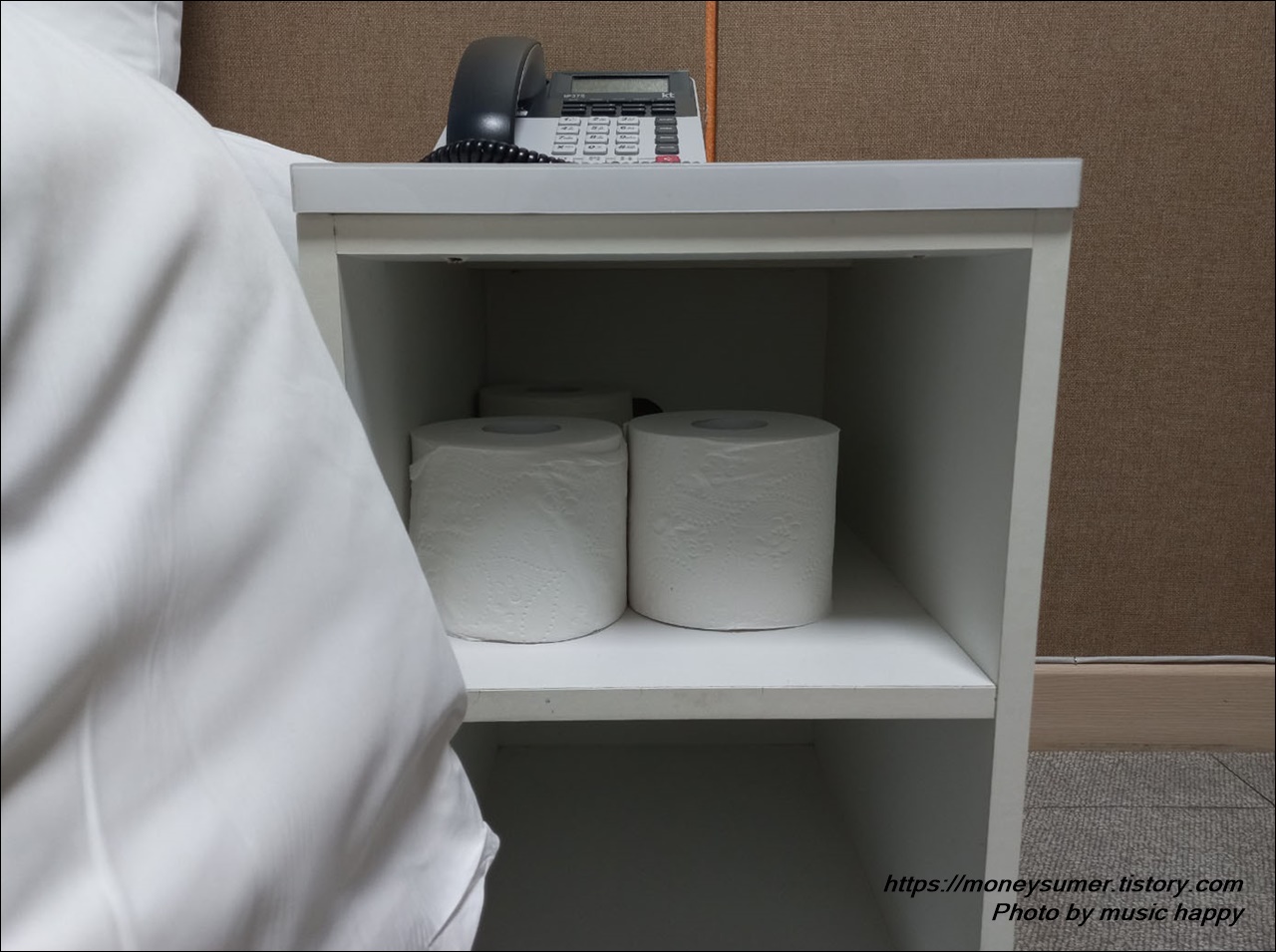 침대 바로 옆 선반에는 롤 화장지가 넉넉히 비치되어 있고 선반 맨 위에는 전화기가 놓여 있어요~