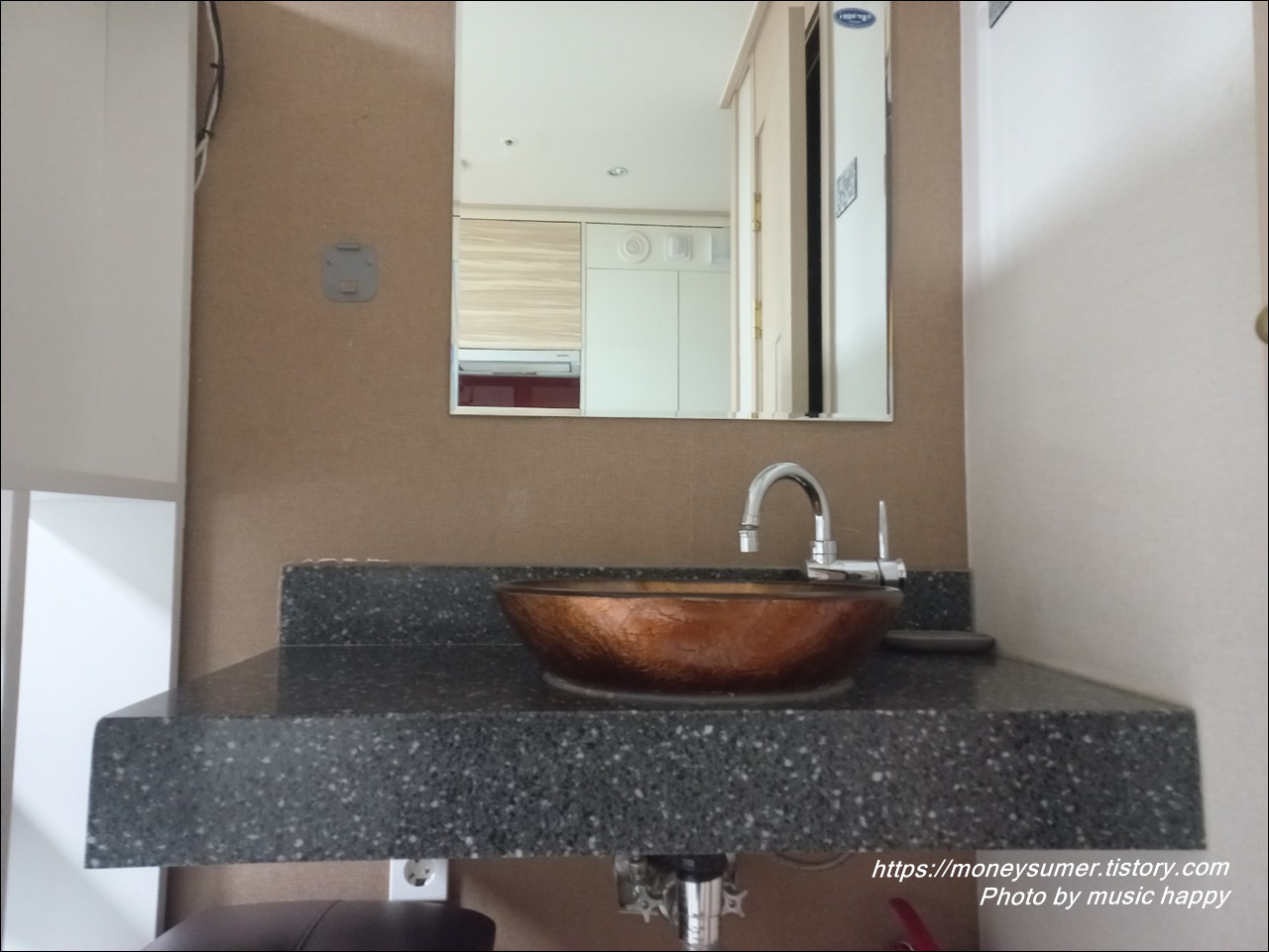 세면대는 욕실밖에 있어서 한편으로는 불편하기도 하고 또다른 한편으로는 편하기도 한 위치네요~