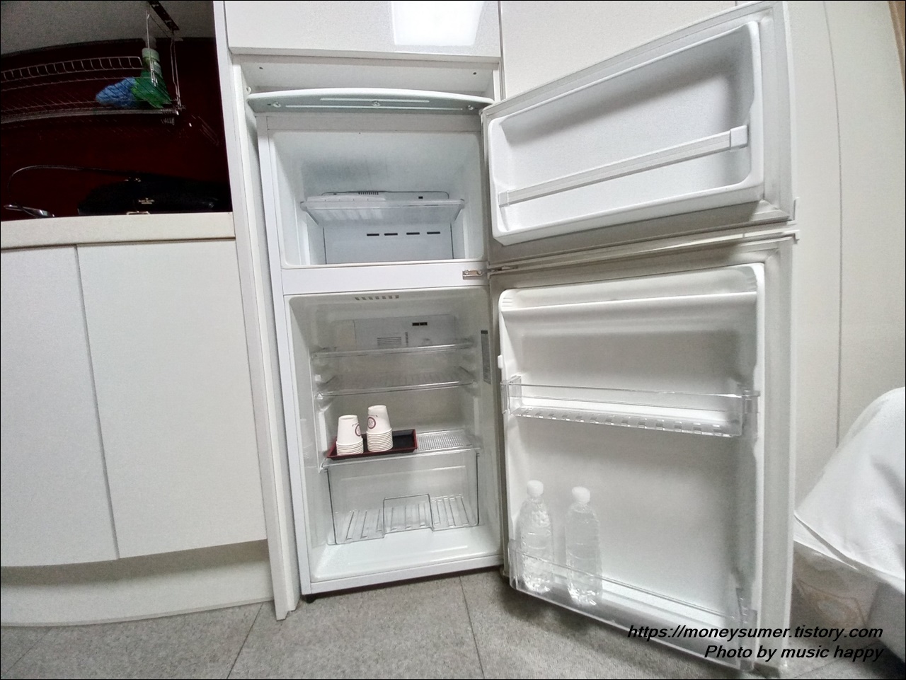 냉장고에는 생수 2병과 종이컵이 들어있고