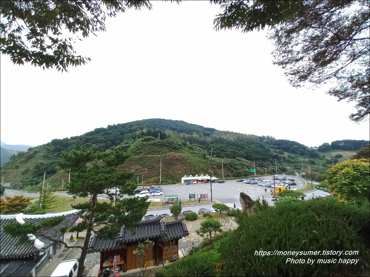 정문 앞 주차장이 보였어요~ 주차장 주변도 산으로 둘러싸여 있어 보기에 좋더라고요~