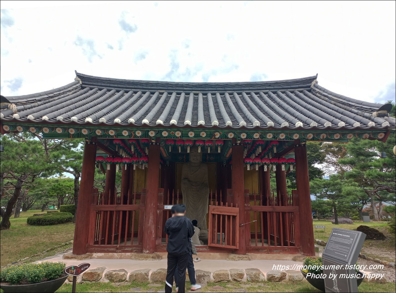 돌로 만든 서 있는 불상인 석조여래입상은 통일 신라 말기 불상과 비슷한 당당한 느낌의 어깨와 목의 형식화된 주름, 사실적이지 않은 손 등에서 고려 초인 10세기 무렵 작품의 특징이 드러난다고 합니다. 소원을 빌고 있는 사람이 있어 아쉽게도 자세히 찍지는 못했어요.