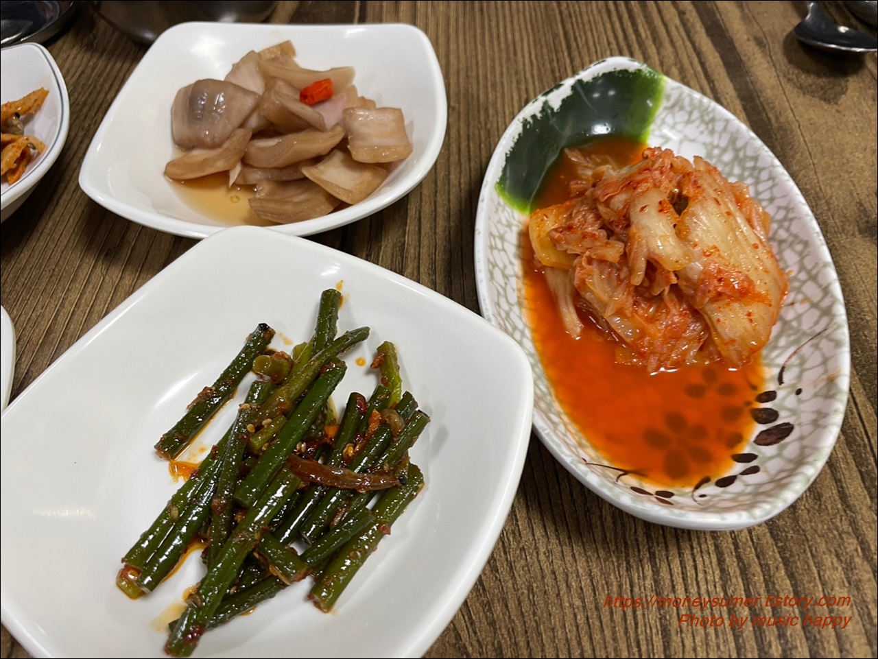 청국장, 나물무침이 나왔어요. 모든 반찬이 맛있었지만 특히 이 청국장은 다른 곳에서는 맛볼 수 없는 음식이었어요. 얼핏 보기에는 비지 같았으나 사장님께 여쭤보니 청국장에 양념을 더해 만든 것이라고 하네요.