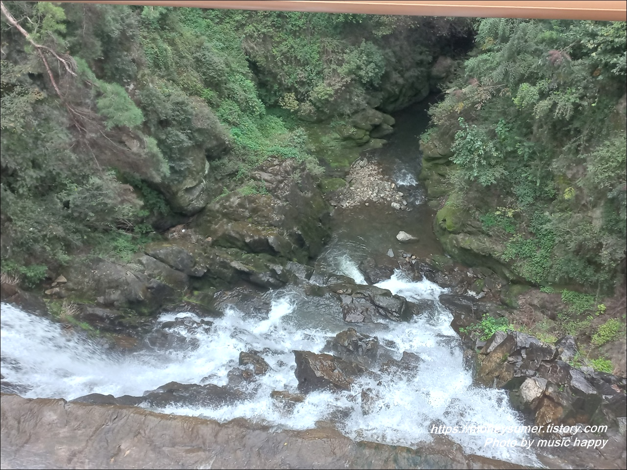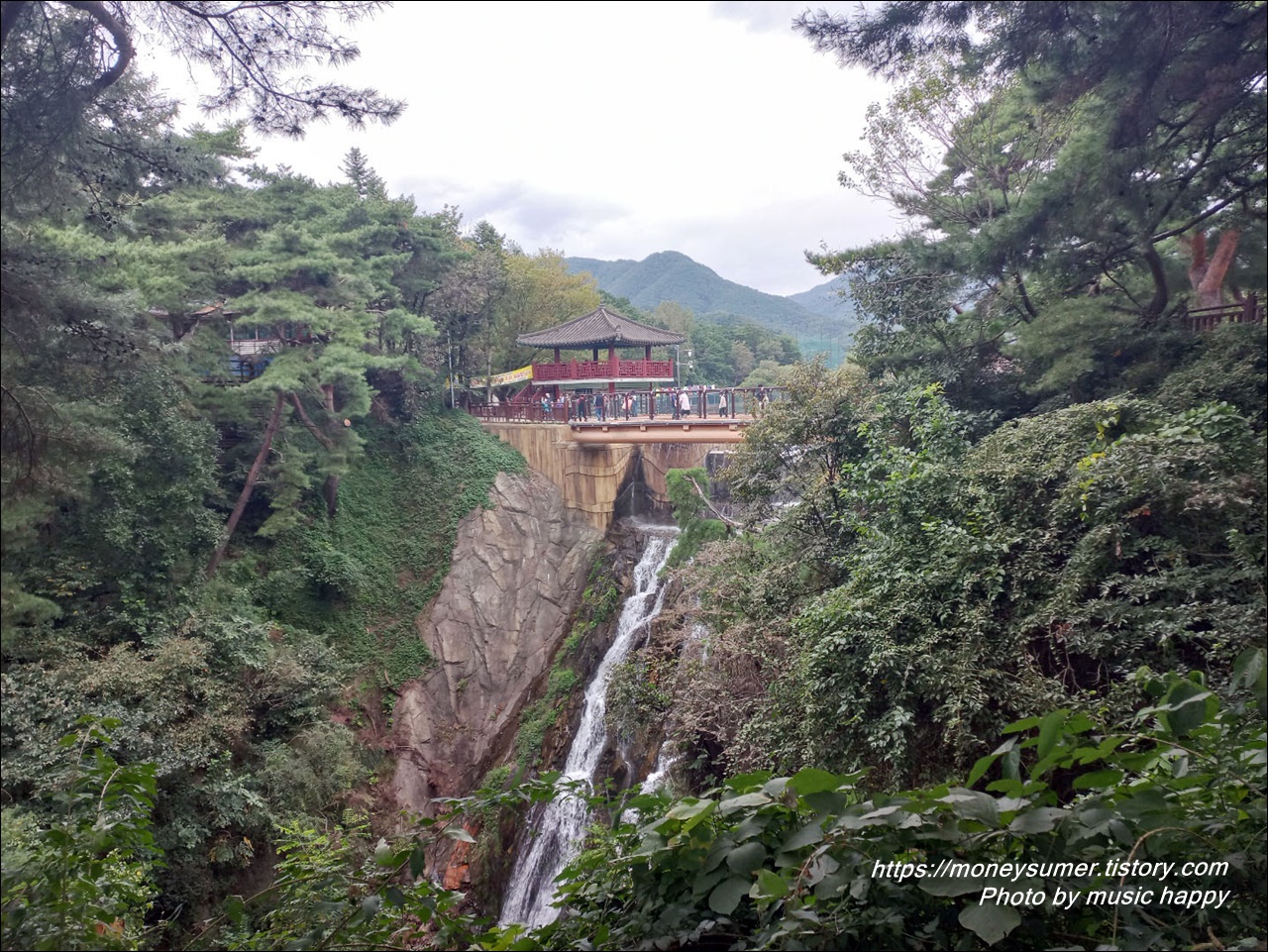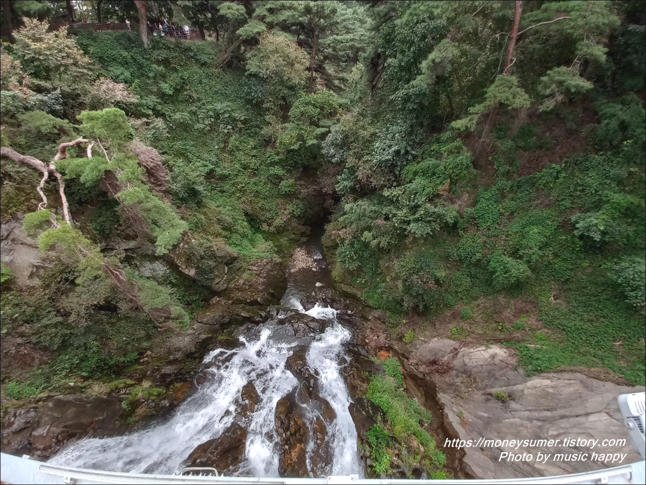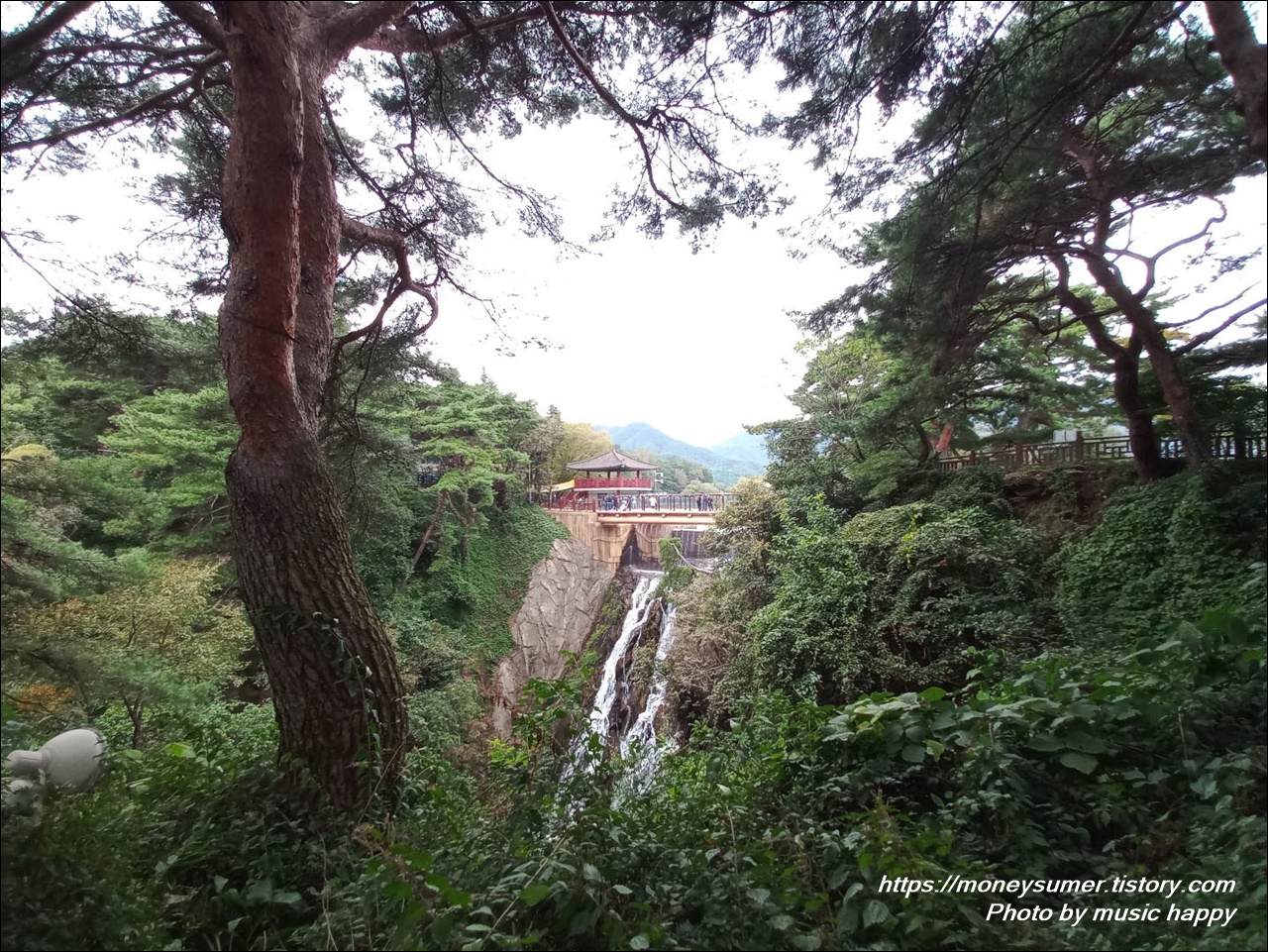 물줄기가 시원하게 흐르는 용추폭포와 홍류정옆 유리 전망대 위를 거니는 사람들 그리고 그 주위를 둘러싸고 있는 나무들이 모여 숲을 이룬 모습이 말로는 다 표현하기 어려운 아름다운 장관(壯觀)을 이루고 있어요~
