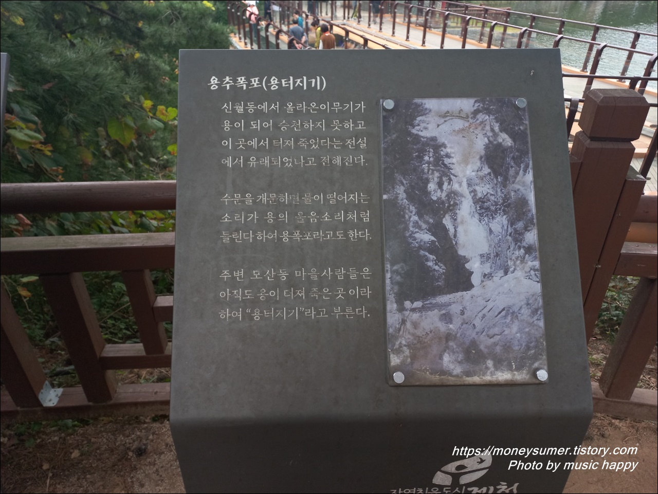 신월동에서 올라온 이무기가 용이되어 승천하지 못하고 이곳에서 터져 죽었다는 전설에서 유래되어 용터지기 또는 용추폭포라 부른답니다.
