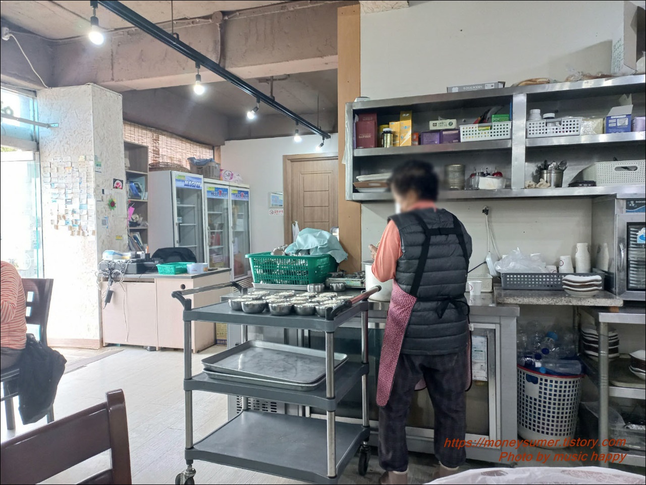 내부 또한 평범했고요. 홀은 입식테이블인데 안쪽에는 룸도 있는 것 같더라고요. 룸 쪽은 가보지 않아서 어떤지 잘 모르겠네요. 저희가 간 시간이 11시 30분쯤이었는데 벌써 식당 안에 손님들로 꽉 차 있었어요. 다른 음식들은 식당 안쪽 주방에서 나오는데 밥만 홀에서 계속 담고 계시더라고요.