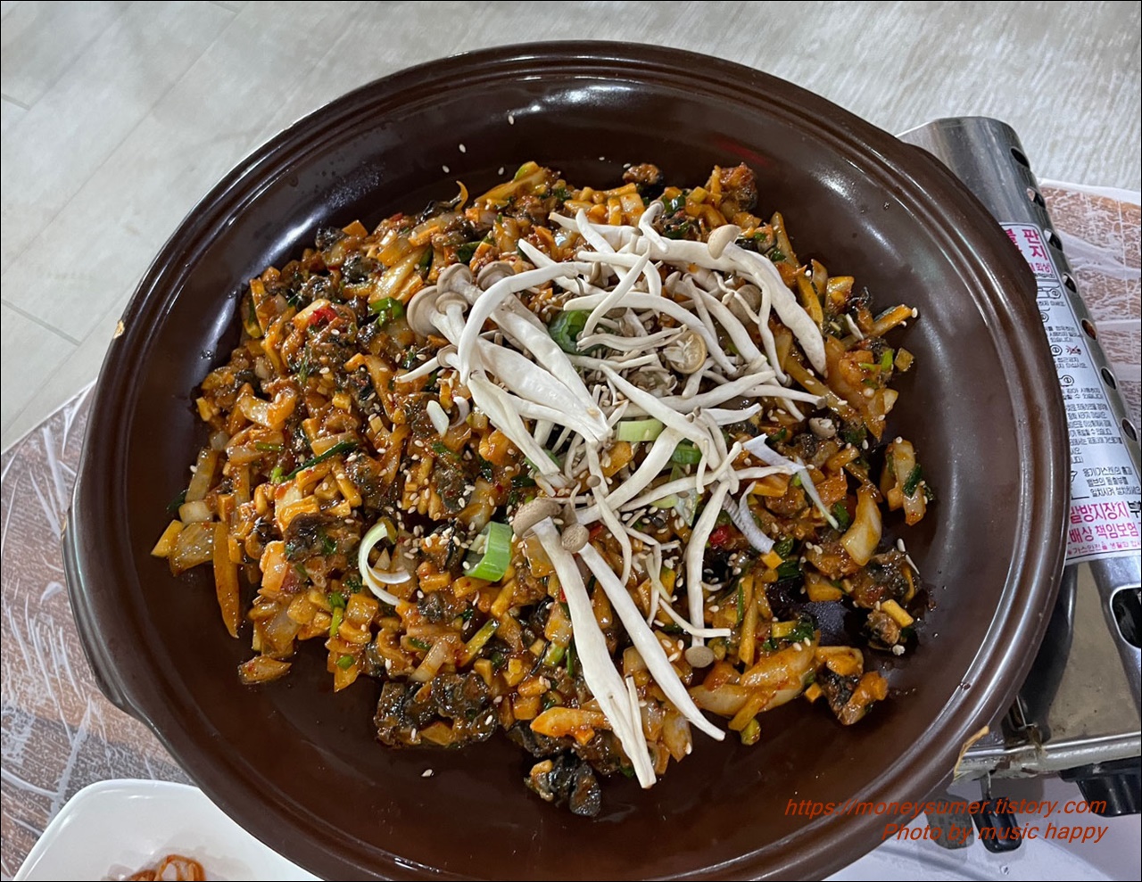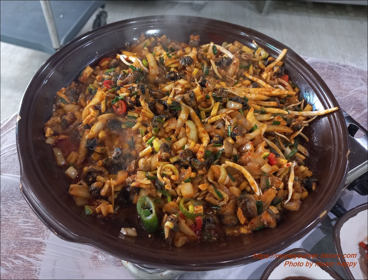 드디어 메인 메뉴인 우렁 볶음(우렁쌈밥 2인분: 24,000원)이 나왔어요. 다른 음식점들은 오목한 뚝배기에 쌈장처럼 나오는 게 보통인데 이곳은 넓은 전골냄비 같은 곳에 각종 야채와 우렁이 푸짐하게 나오더라고요.