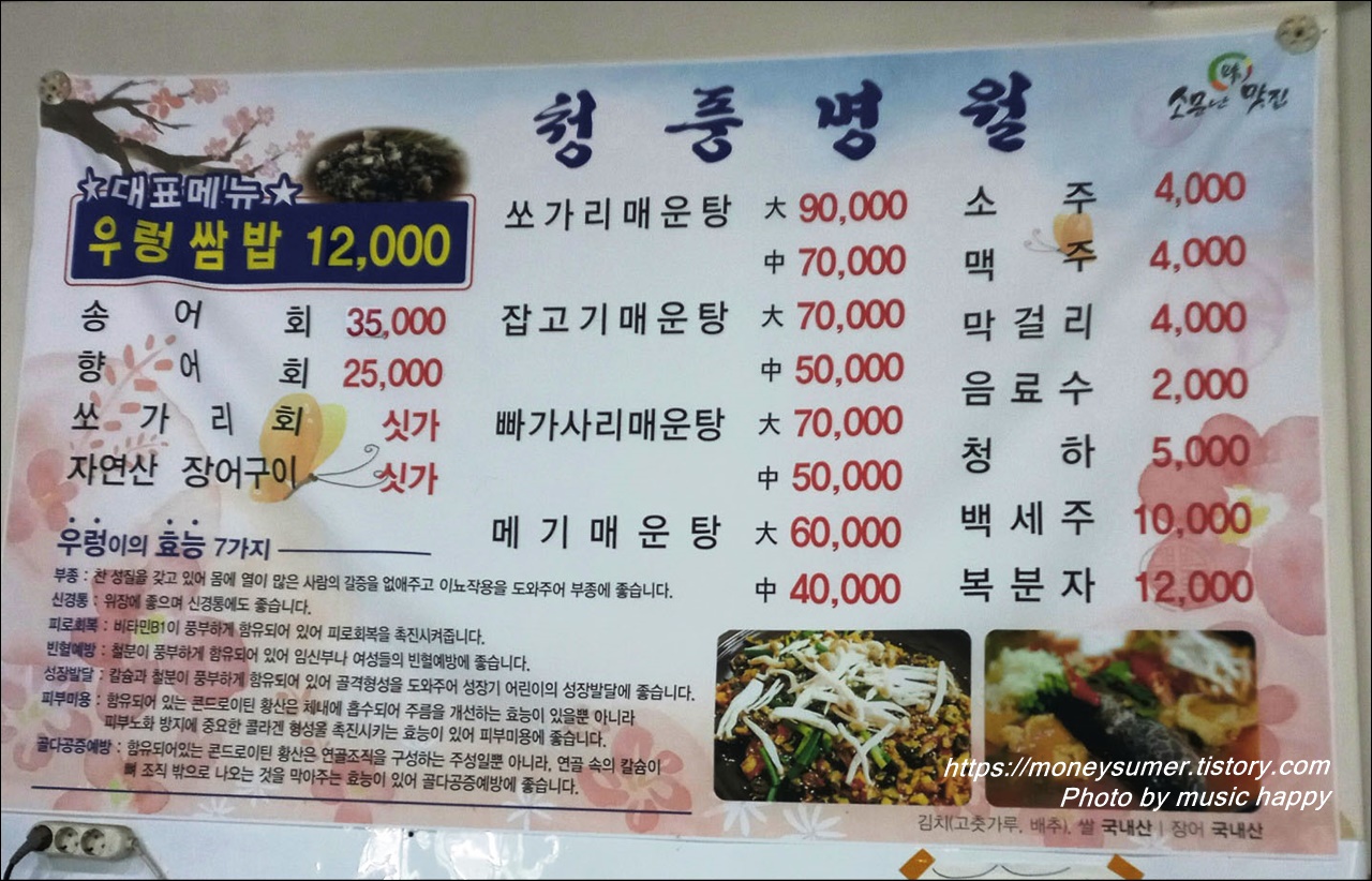 - 매운탕 : 쏘가리, 잡고기, 빠가사리, 메기 ☞ 40,000~90,000원