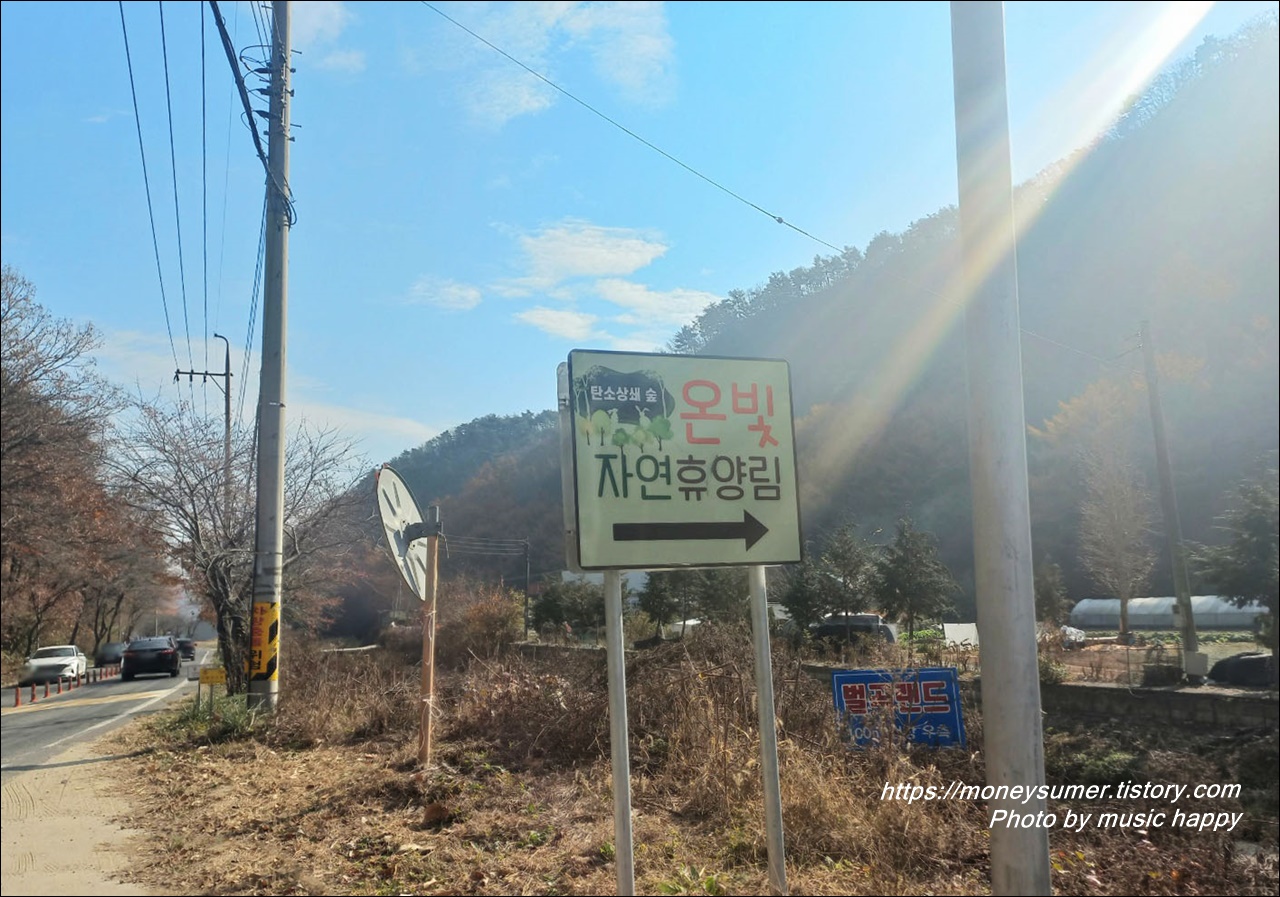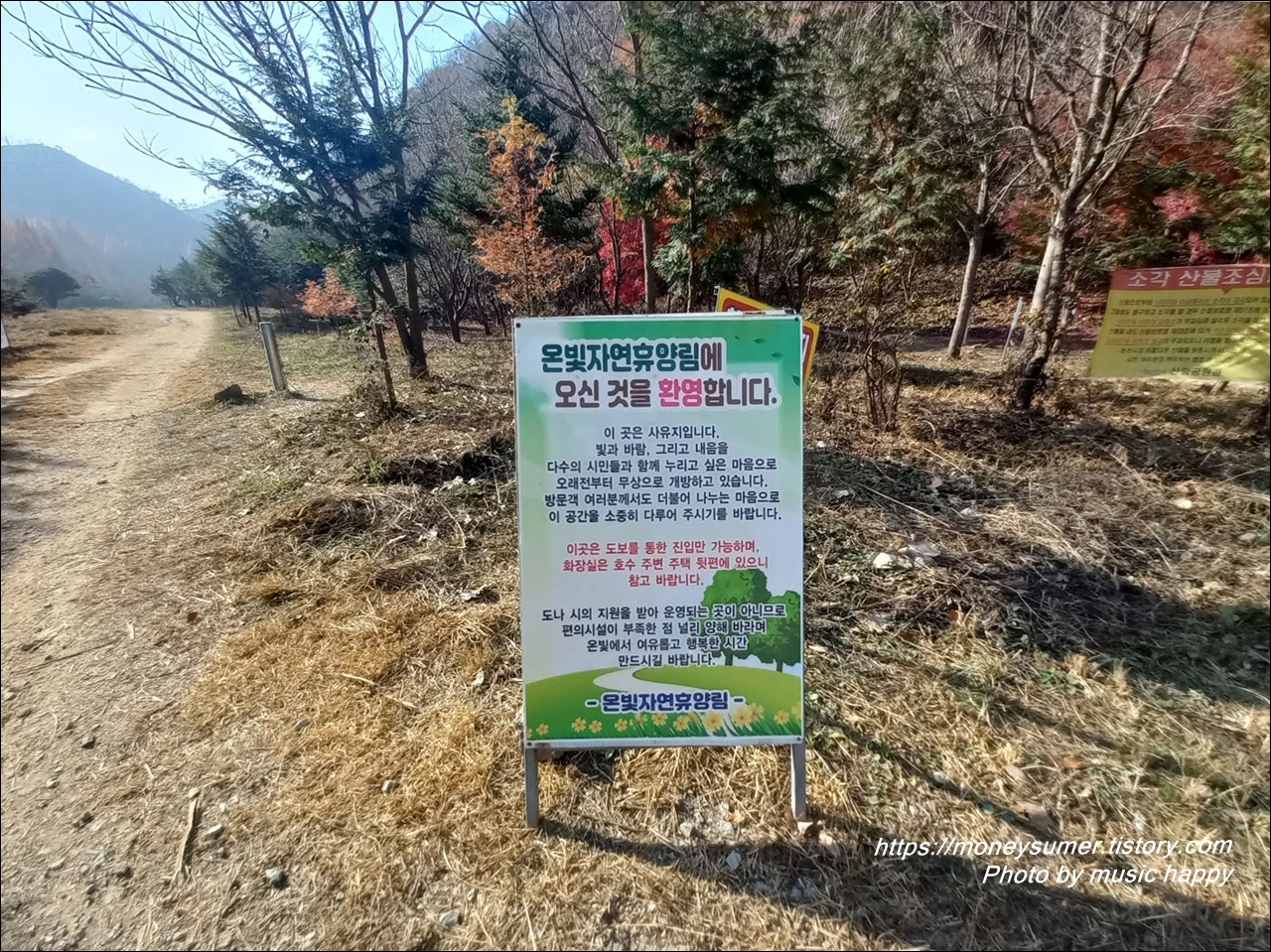 온빛 자연휴양림은 사유지임에도 불구하고 오래전부터 무상으로 개방하고 있다고 하네요. 화장실은 호수 주변 주택 뒤편에 있다고 하니 화장실 이용하실 분들은 참고하세요~