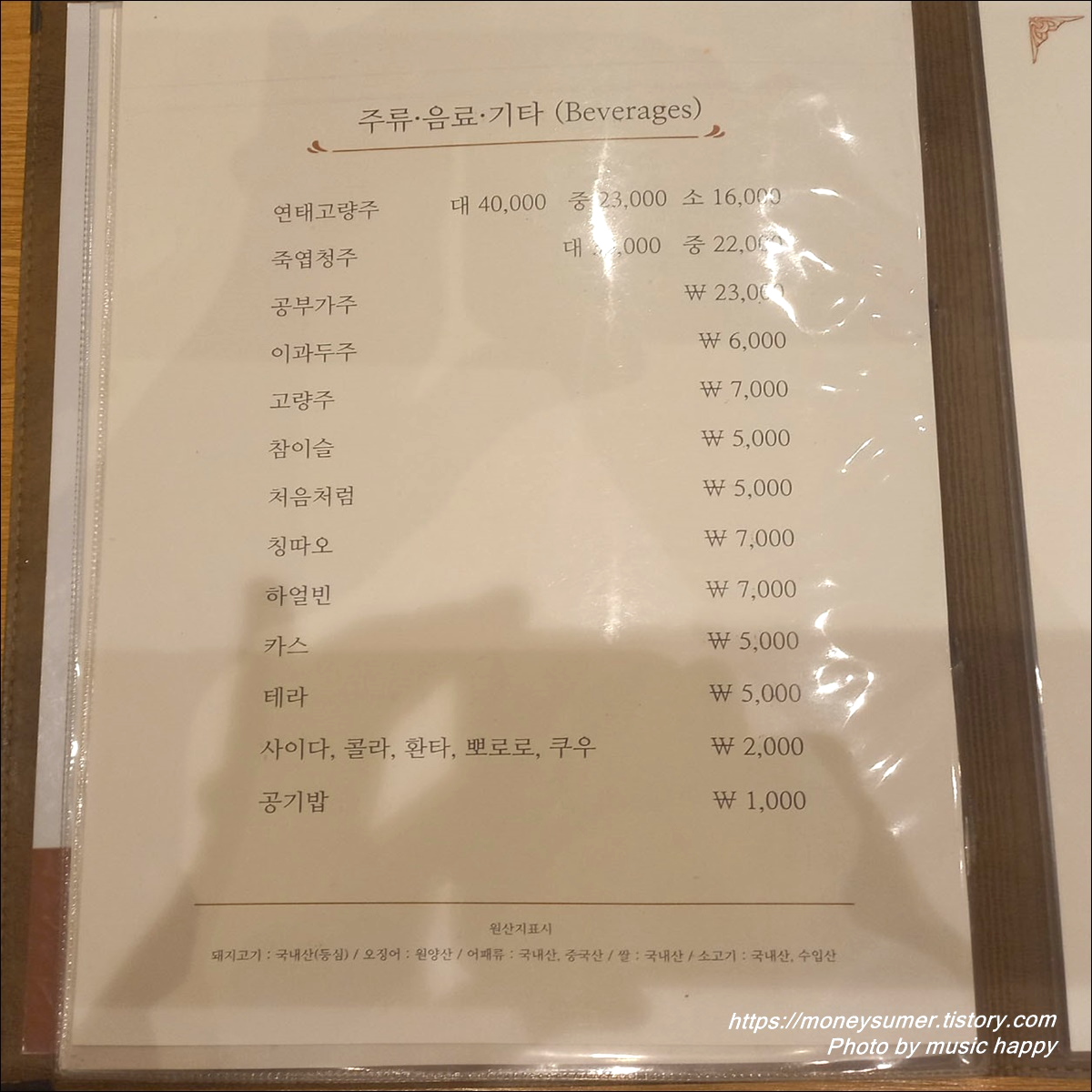 - 주류/ 음료 : 사이다, 연태고량주 등 2,000원 ~ 40,000원