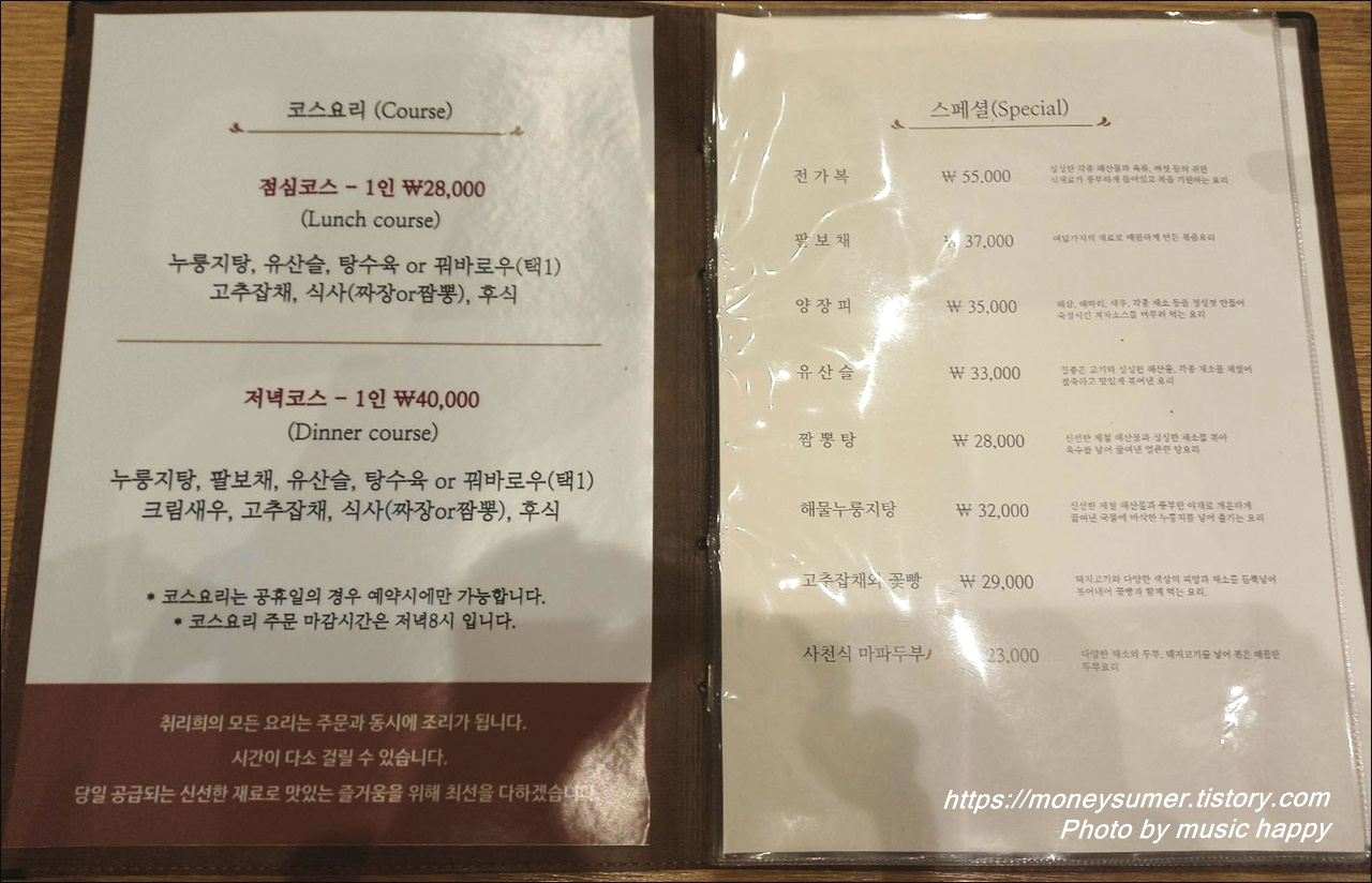 - 코스요리 : 점심 코스 1인 28,000원/ 저녁 코스 1인 40,000원(공휴일의 경우 예약 필수)