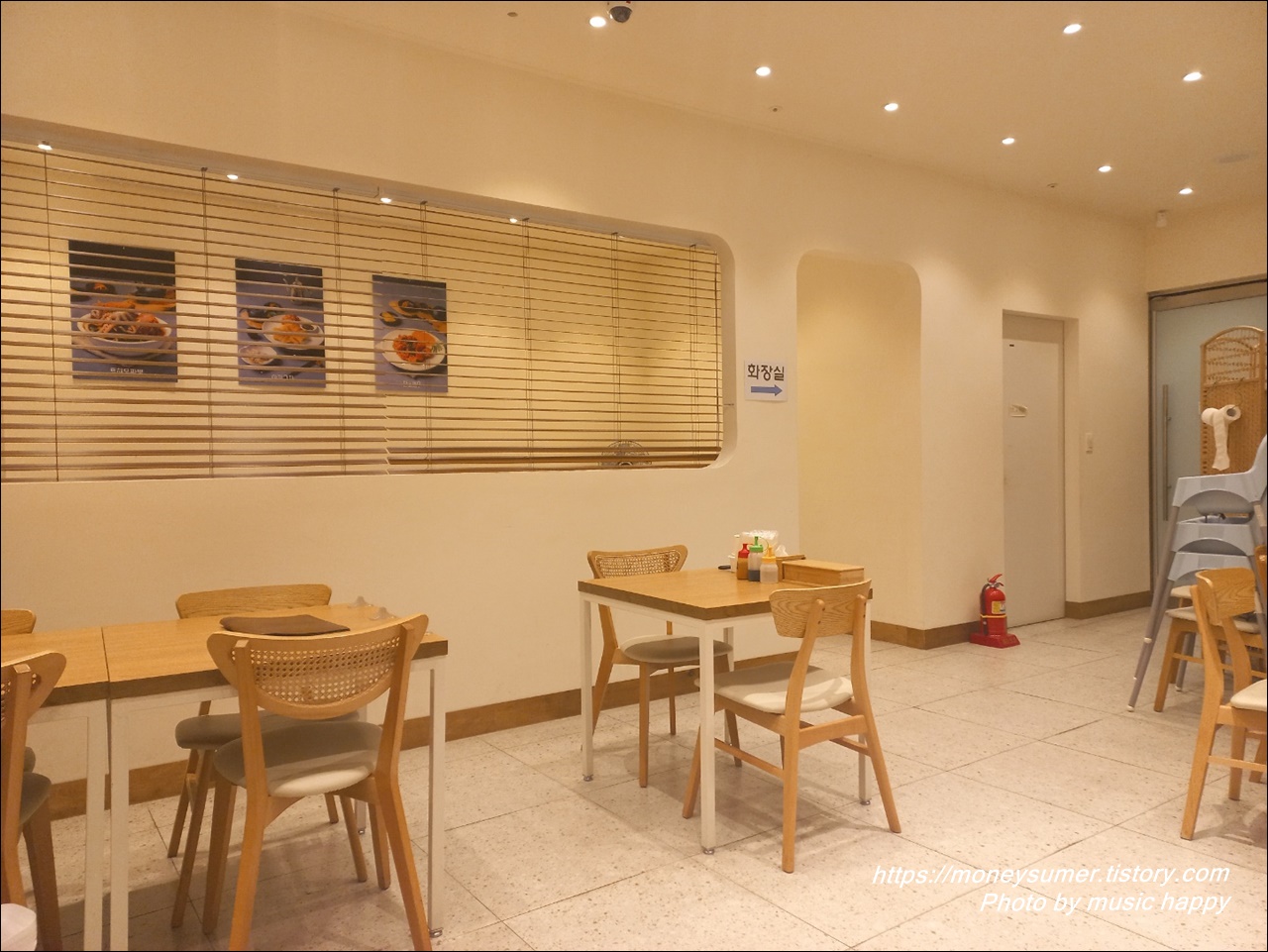 깔끔한 인테리어와 아기의자도 당연히 비치되어 있네요. 화장실은 식당을 나가면 건물 복도쪽에 있고 비밀번호를 숙지하고 가셔야 해요. 화장실에 화장지가 없기 때문에 미리 화장지를 챙겨가셔야 하고요.
