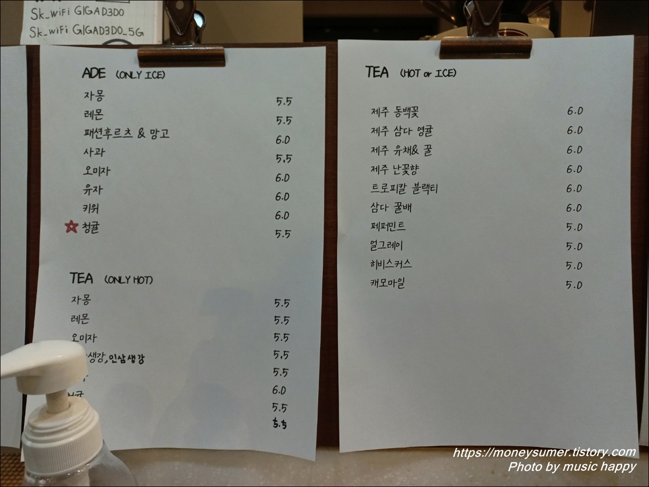 - TEA류 : 카모마일 5,000원 ~ 제주 동백꽃 6,000원