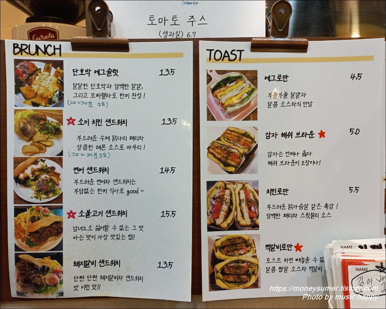 - 토스트 : 에그로만 4,500원 ~ 떡갈비로만 6,000원