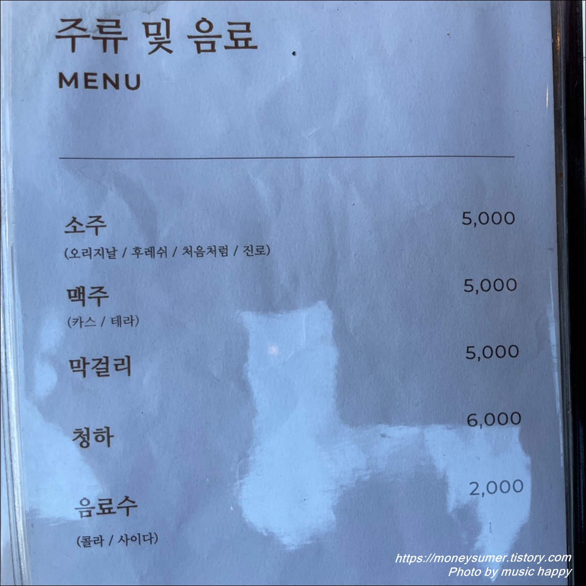 - 주류 및 음료 : 소주, 맥주, 막걸리 5,000원/ 음료수 2,000원/ 청하 6,000원