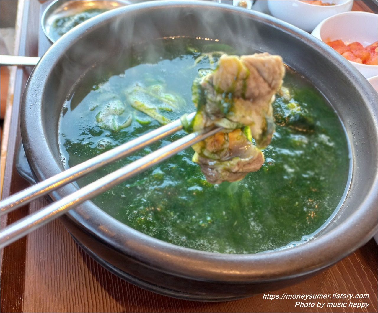 갈비탕에 들어있는 고기를 소스에 찍어먹으니 부드러운 고기 맛이 너무 맛있어요. 신랑이 먹어보라고 준 매생이는 철분과 칼륨, 단백질 등을 많이 함유하고 있다 하니 건강에도 좋은 음식이네요.