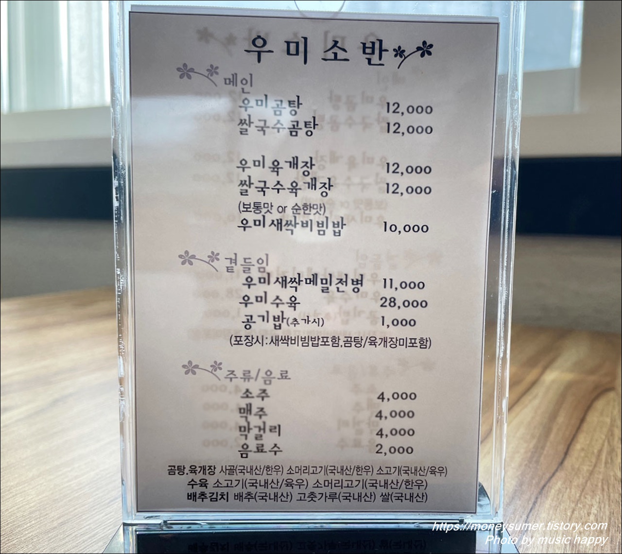 - 우미새싹메밀전병 11,000원, 우미수육 28,000원, 공깃밥 1,000원