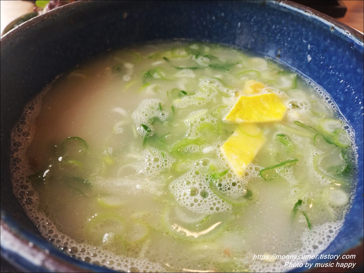 뽀얀 국물에 고기, 당면, 계란지단, 파가 들어있어요.