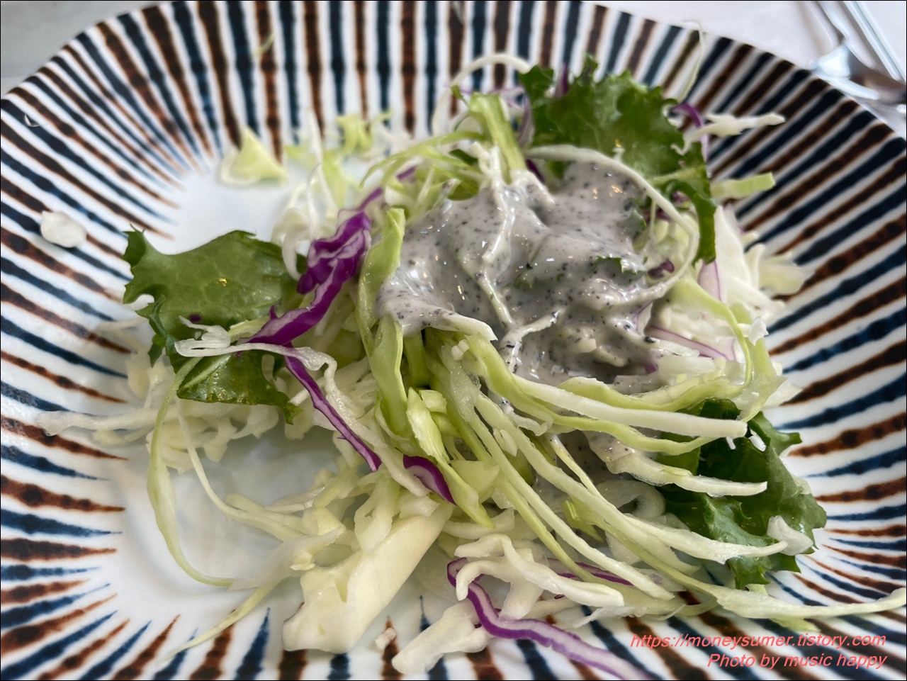 밑반찬으로는 연근샐러드와 양배추샐러드,