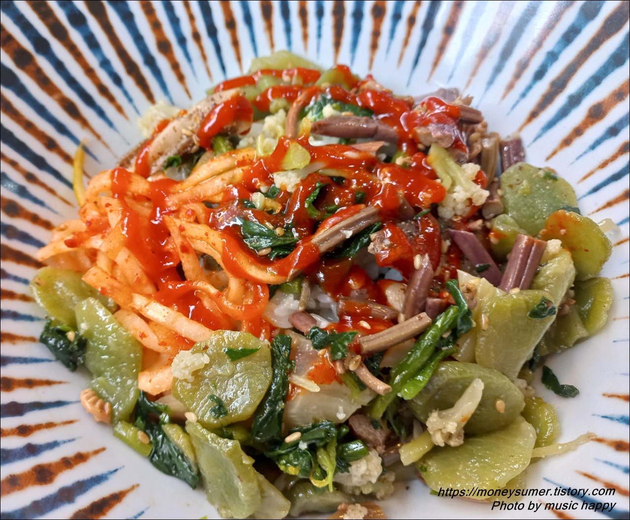 개인접시에 밥과 나온 반찬을 조금씩 다 덜어서 간장소스 약간 뿌리고 고추장도 뿌려서