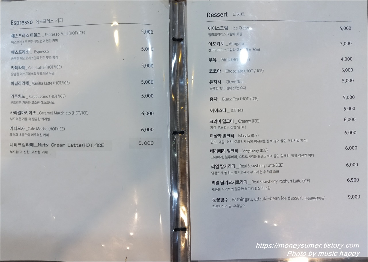 - 디저트 : 아이스크림 5,000원 ~ 눈꽃빙수 9,000원