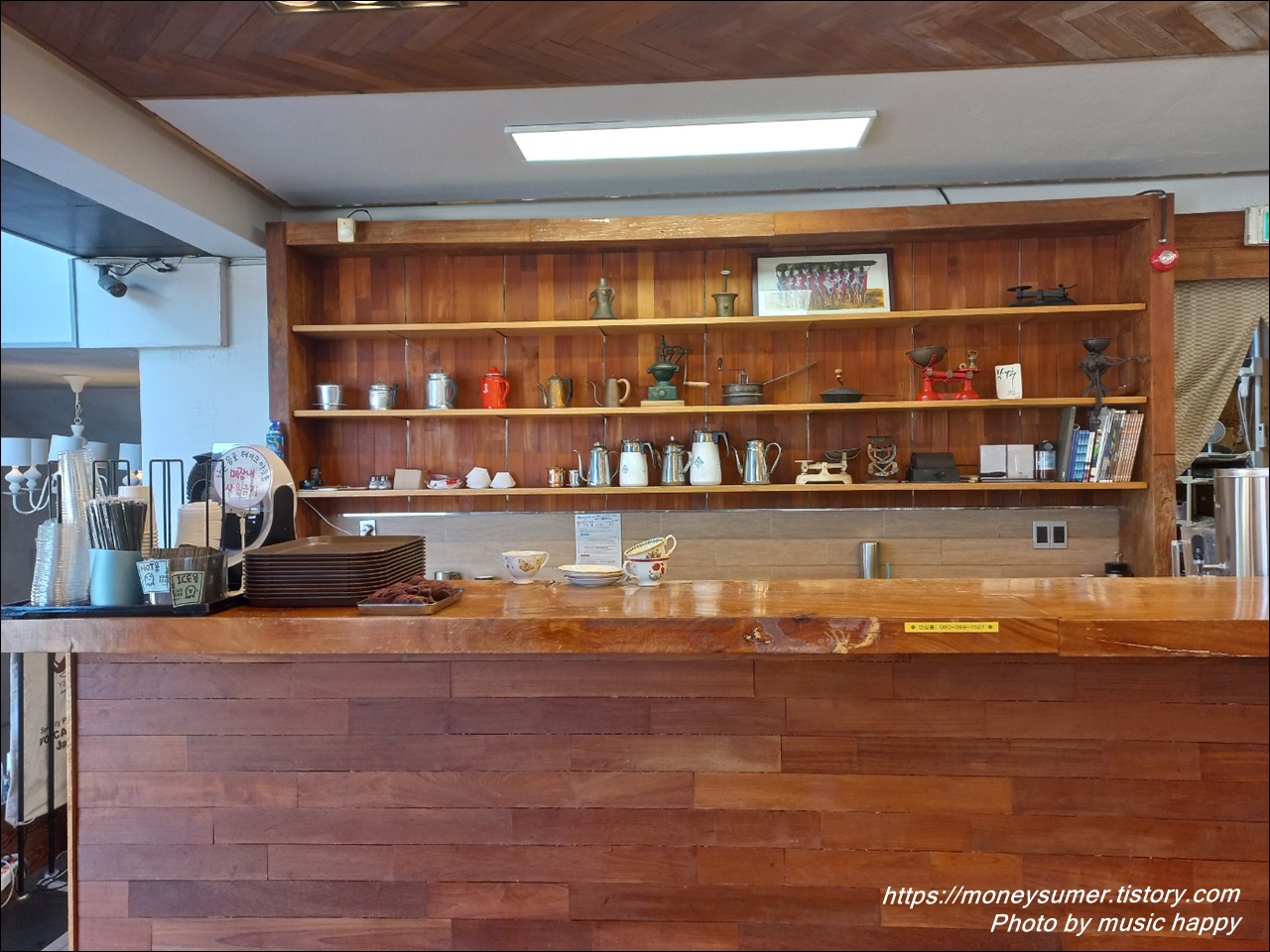 뒷배경으로 각양각색의 커피주전자가 많이 전시되어 있는 서비스바(service bar)예요. 직원들이 다른 곳에 있을 때 급하게 찍었답니다~😊