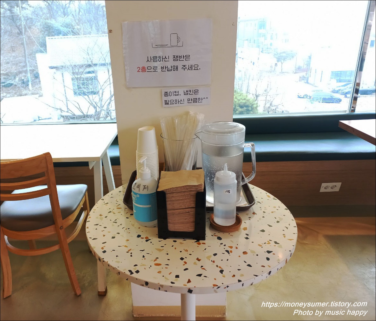 종이컵과 냅킨이 따로 마련되어 있고 다 먹고 난 쟁반은 2층으로 반납하면 된답니다.