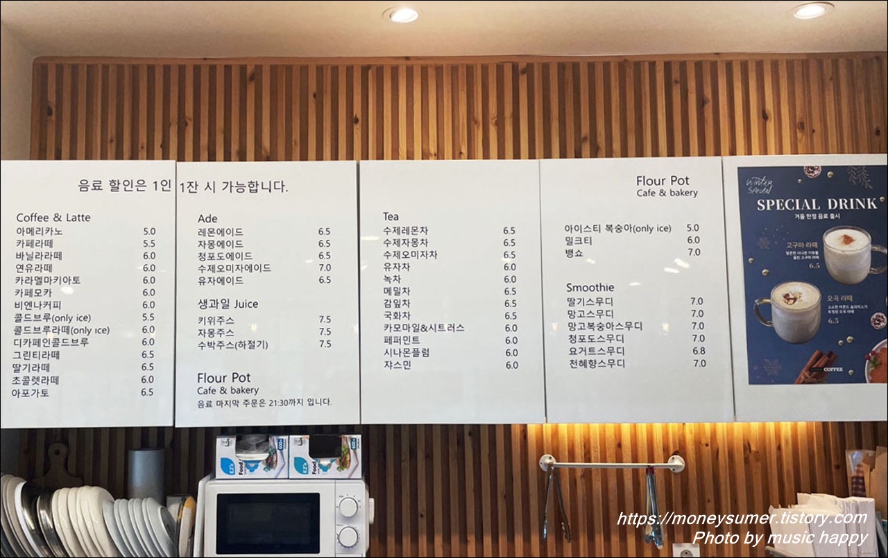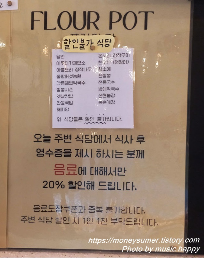 저희는 집에서 아침을 먹고 점심 전에 카페를 갔었기 때문에 할인을 못 받았지만 주변 식당에서 식사 후 플라워팟을 이용하신다면 음료에 대해서만 20% 할인도 하고 있네요. 물론 모든 식당이 되는 건 아니고 제외식당이 있으니 참고하세요~