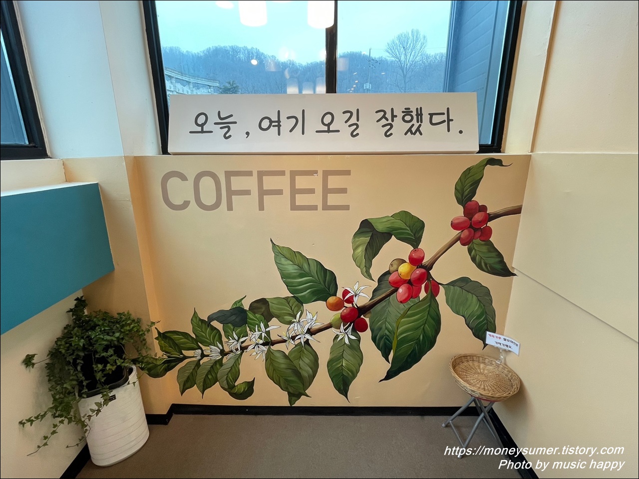 카운터가 있는 2층으로 올라갔어요~ 올라가다보니 예쁘게 그려진 커피나무의 그림과 함께 '오늘, 여기 오길 잘했다'라는 문구가 있네요. 문구 선택을 잘한 것 같아요~😊