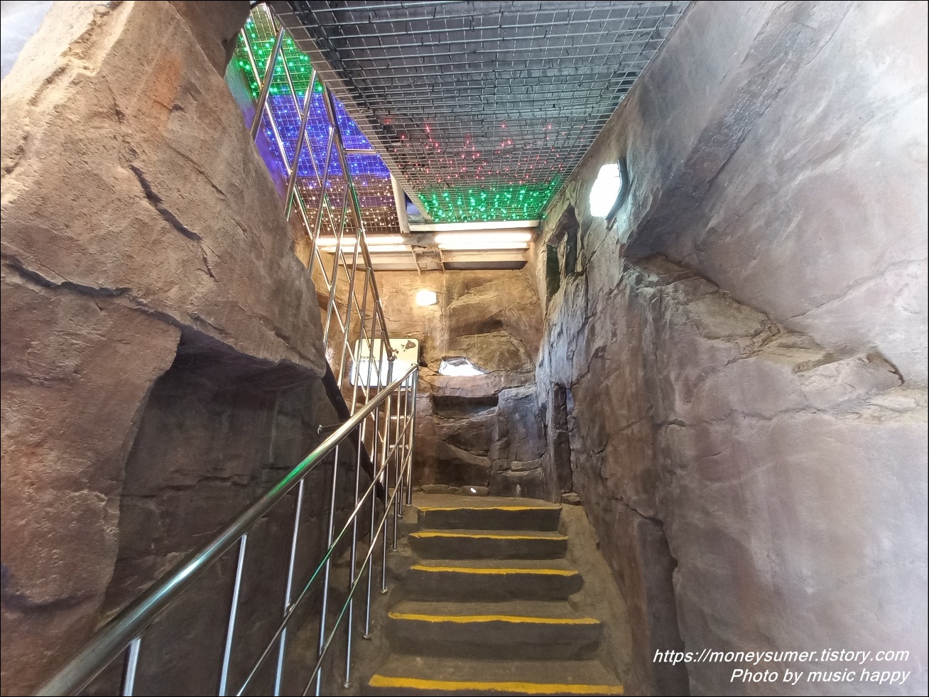 내부는 동굴느낌이 나고 계단으로 이루어져 있네요. 길을 밝혀주는 빛이 있고 색색의 예쁜 빛도 있어서 많이 어둡진 않았어요~
