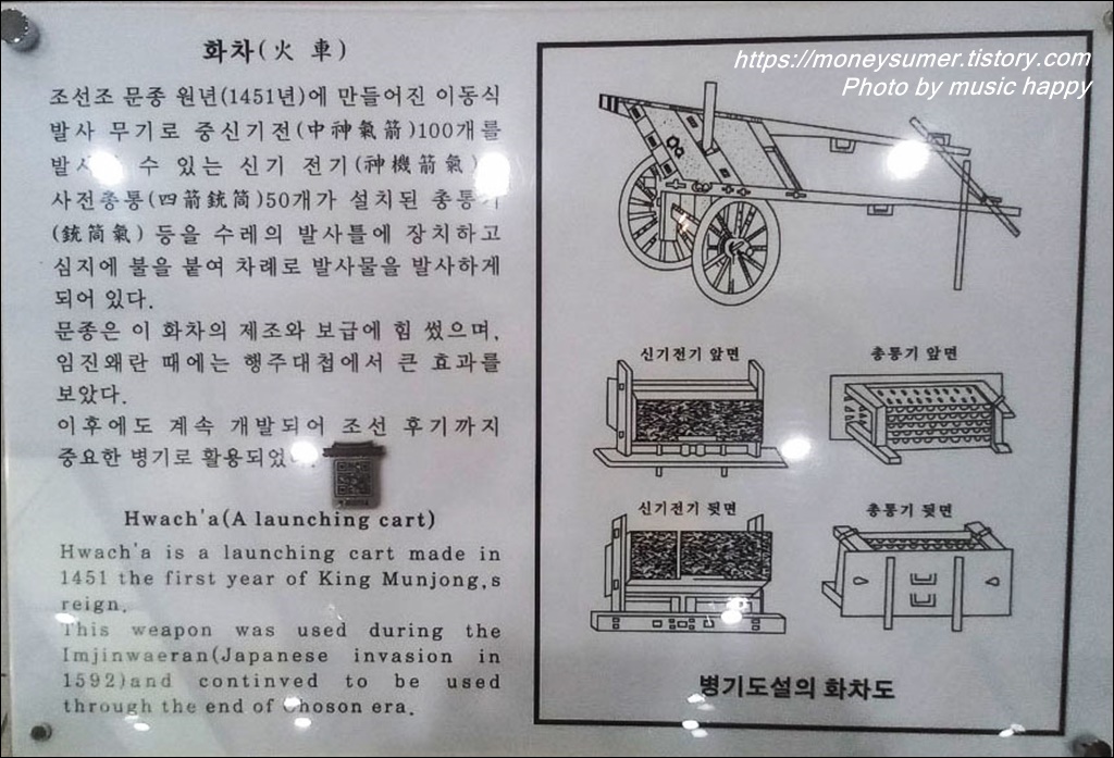 - 변이중화차 - 임진왜란 중 문신이자 학자였던 변이중이 문종화차를 계량하여 만든 것으로 수레 위에 40개의 승자총통을 총통기로 설치하고 총의 심지를 이어서 차례로 쏘게 한 것.