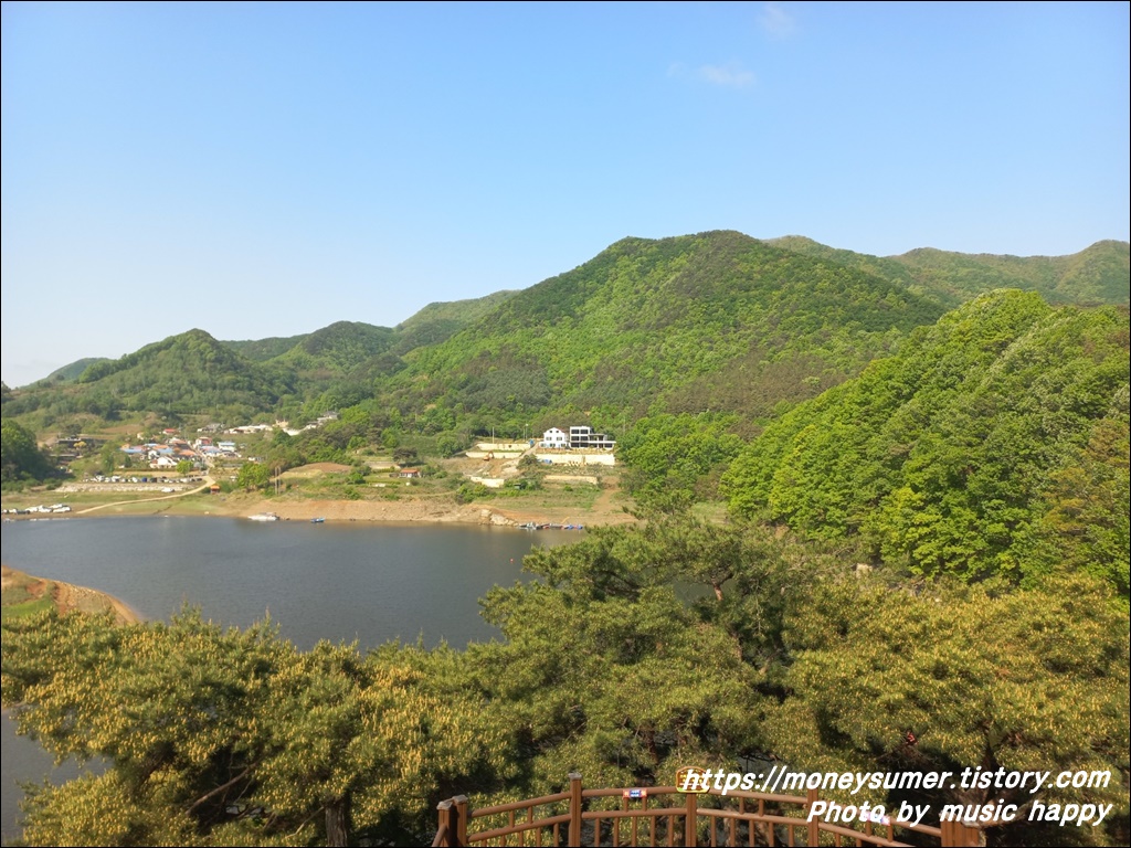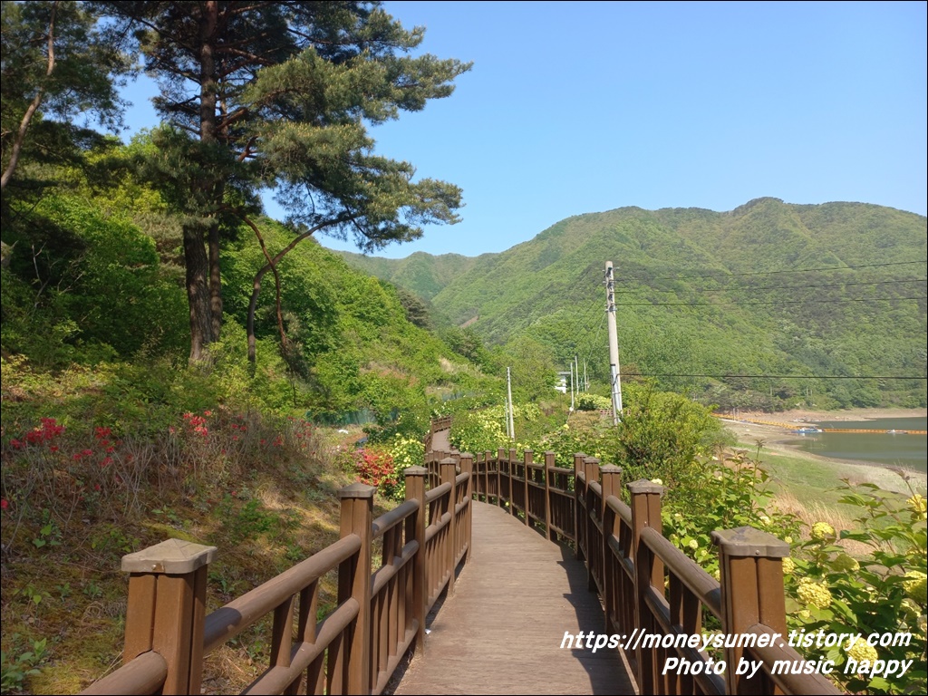 가끔 나무에 가려져 안보일 때도 있긴 하지만 데크길을 따라 걷다 보면 강과 산의 어우러진 아름다운 경치를 구경할 수 있답니다.